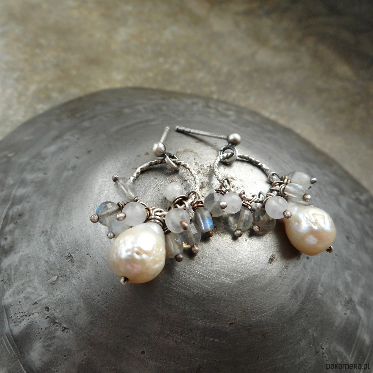 Piękne kolczyki z kamieni naturalnych i szlachetnego srebra; karbowane kółka zawieszone na sztyftach, ozdobione zostały perłami hodowlanymi i drobnymi labradorytami.
