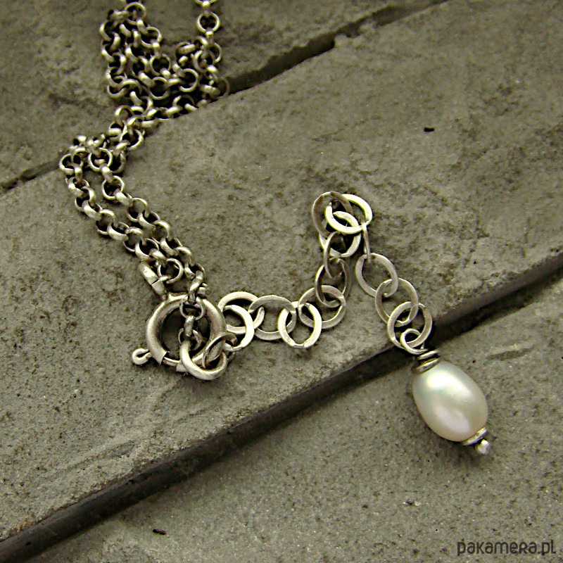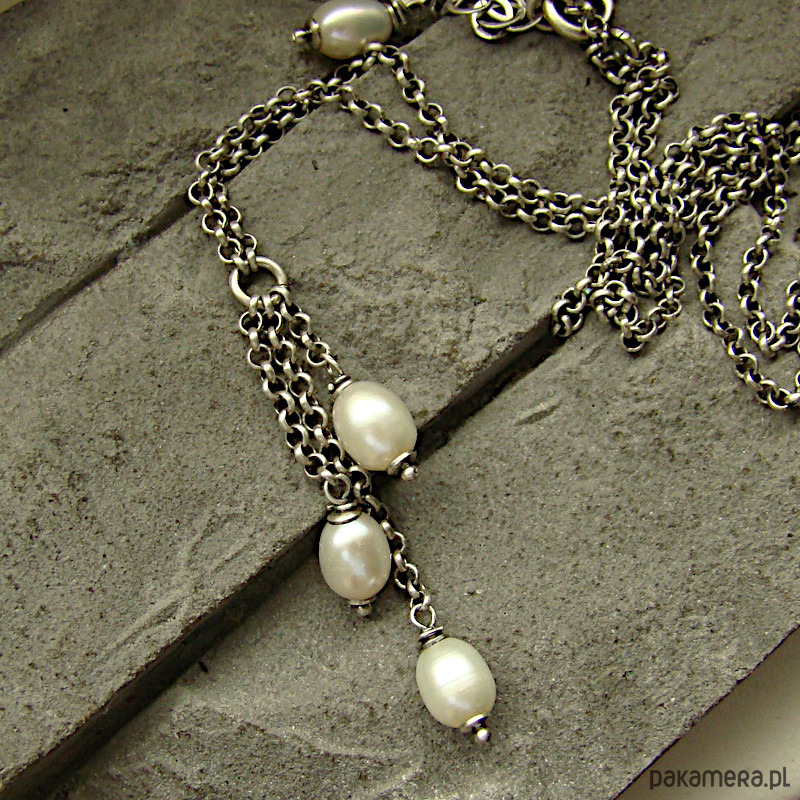 Kobiecy, skromny i oryginalny naszyjnik na co dzień i nie tylko. Wykonany w całości z oksydowanego srebra próby 925 oraz białych, naturalnych perełek wielkości 0,7- 0,8 cm. Solidny łańcuszek typu rolo o grubości 2,2 mm. Całkowita długość wisiorka to ok. 5 cm, a długość łańcuszka to 51 cm plus regulacja 5 cm. W mojej galerii kolczyki i bransoletka do kompletu. Ozdobnie zapakowany.