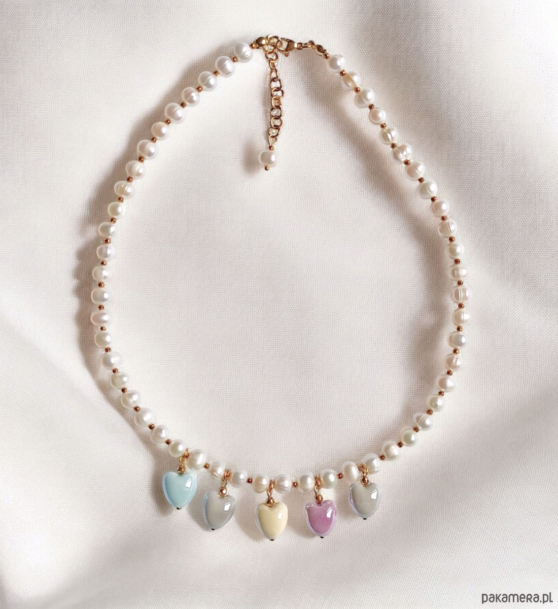 Naszyjnik na solidnej lince stalowej (miękkiej) - został wykonany z naturalnych, nieregularnych pereł słodkowodnych (ok7mm) w klasycznym odcieniu złamanej bieli, drobniutkich przekładek ze złotego hematytu oraz ceramicznych serduszek w pastelowych odcieniach (ok. 13mm)