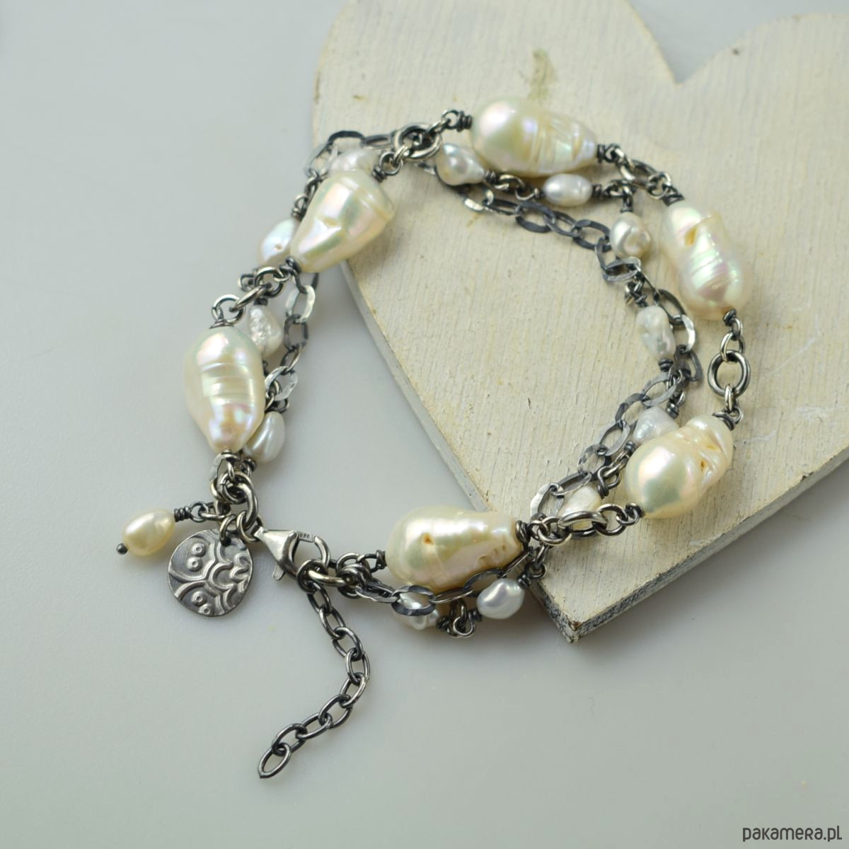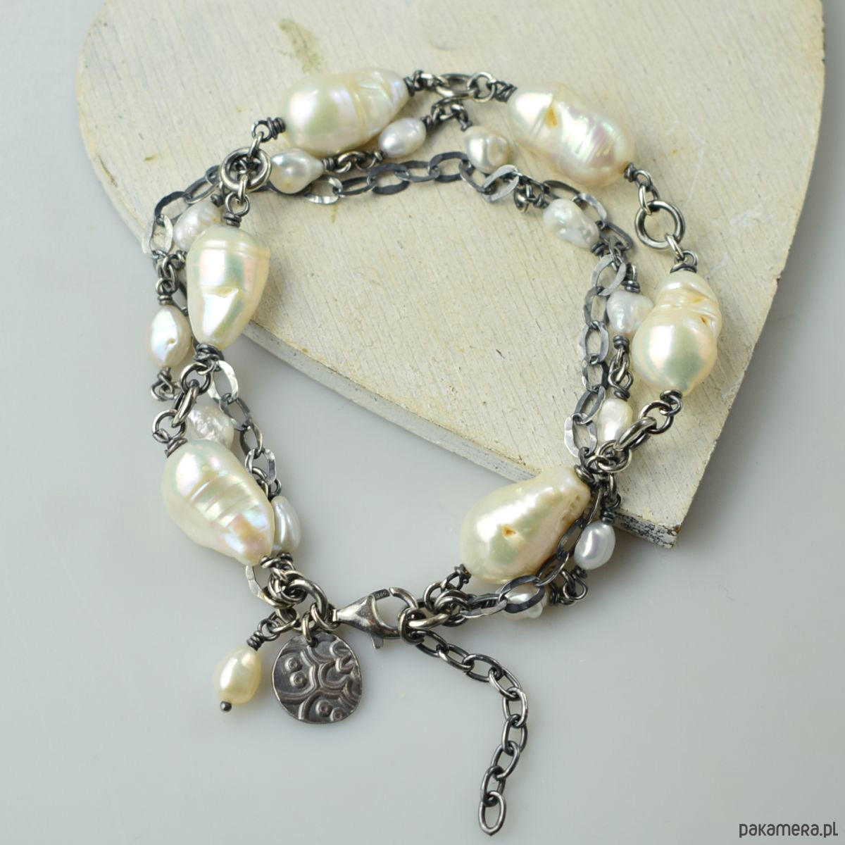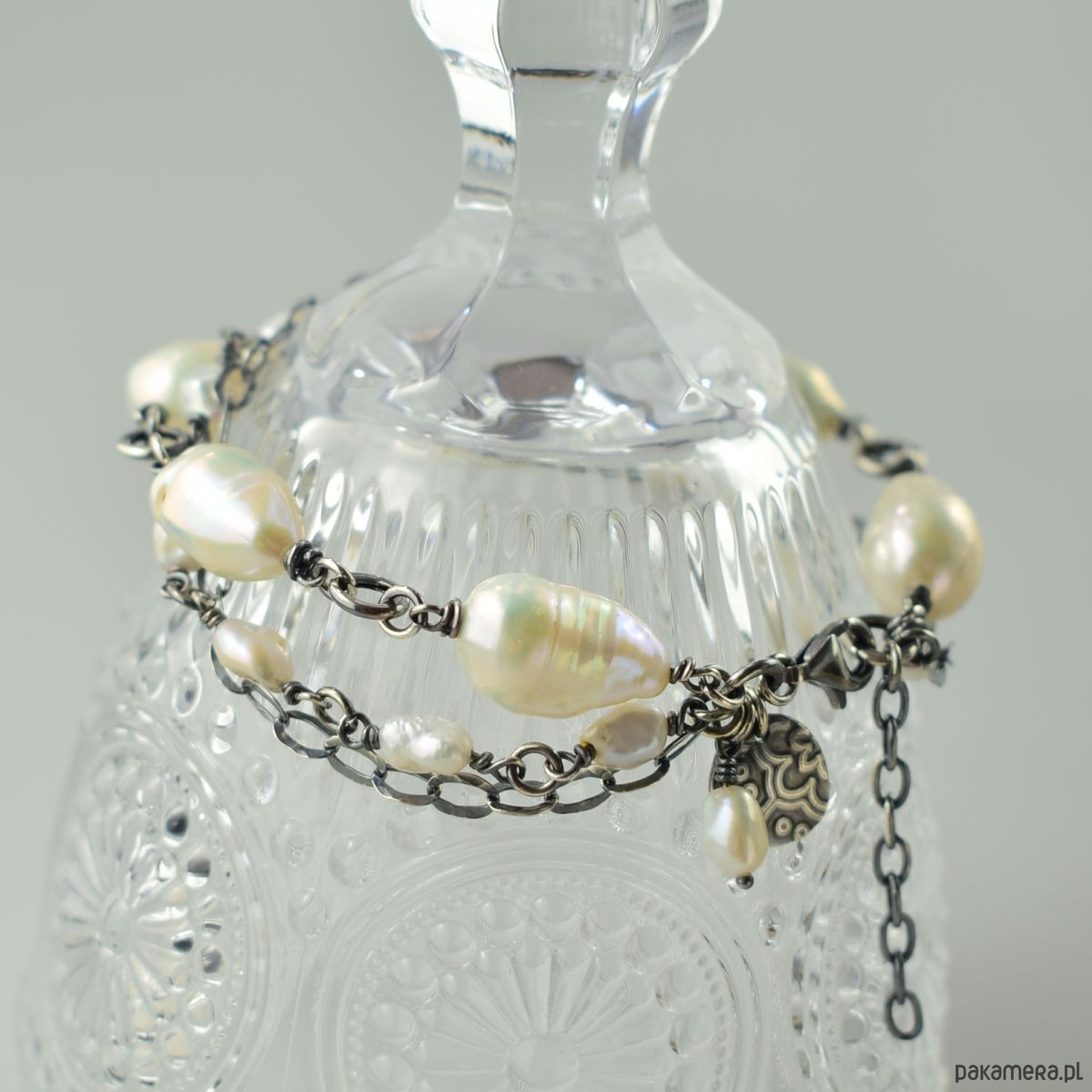Bransoletka wykonana w całości ze srebra (próba 925) z perłami. Całość została zoksydowana (przyciemniona) i wypolerowana. Długość regulowana 21 - 25 cm. Biżuteria zostanie ozdobnie zapakowana.