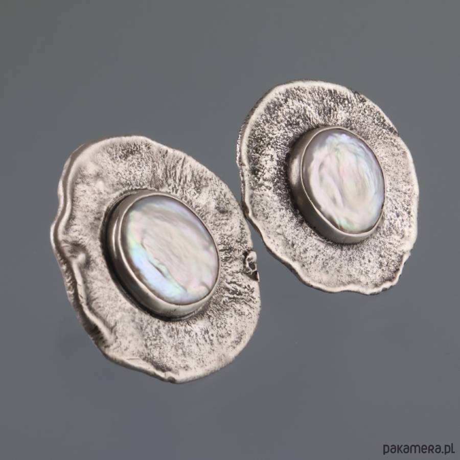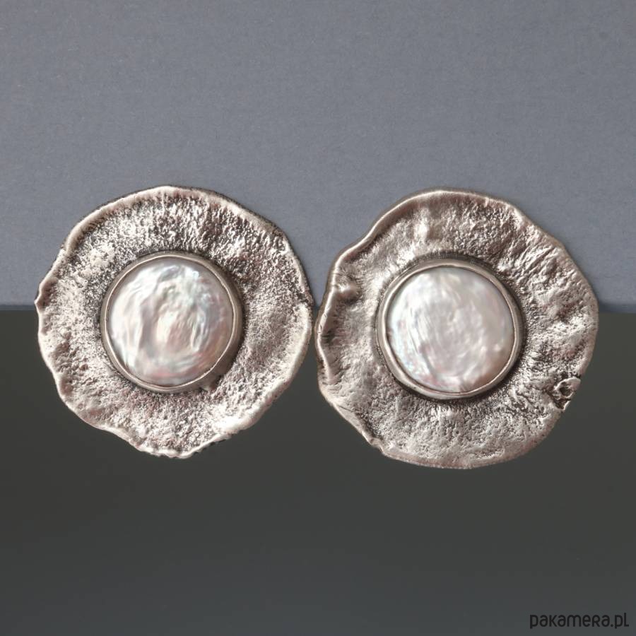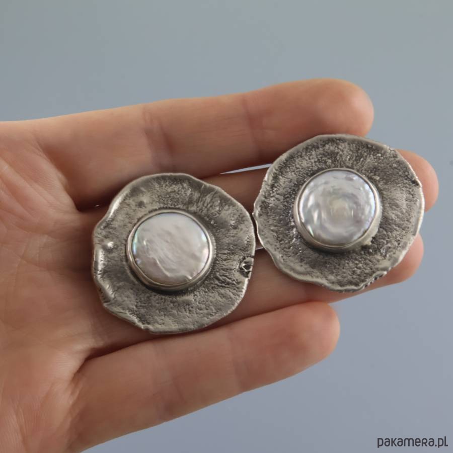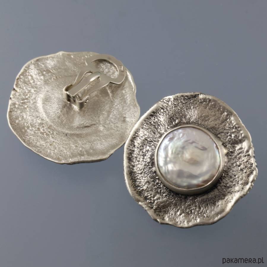 Duże, ręcznie wykonane srebrne klipsy z perłami. Srebro próby 925 - próba wybita na harfie. Średnica klipsów: 3,6 cm. Średnica perły: 1,8 cm. Waga klipsów: 18,9 g.