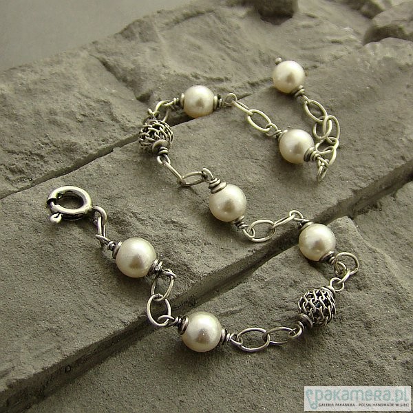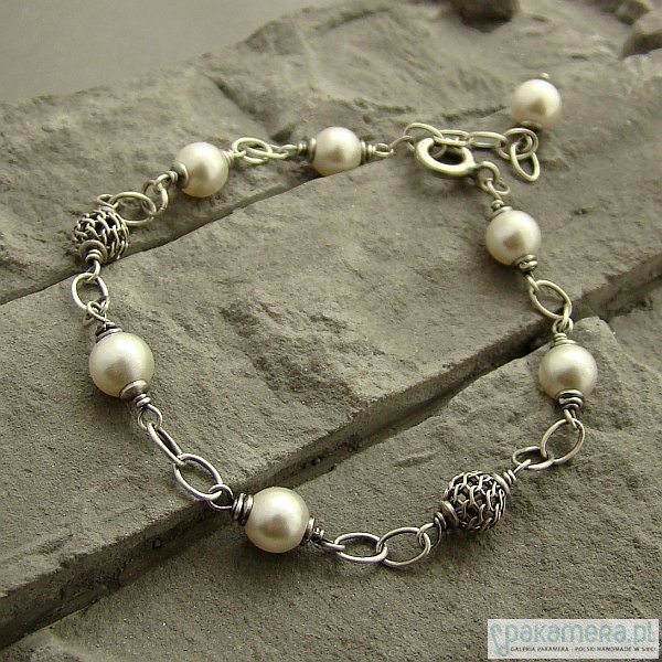 Subtelna i kobieca bransoletka na co dzień i nie tylko. Wykonana w całości z oksydowanego srebra próby 925 oraz białych perełek Swarovski wielkości 6 mm. Całkowita długość bransoletki regulowana, od. 18 cm do 20 cm. W mojej galerii naszyjnik do kompletu. Ozdobnie zapakowana.