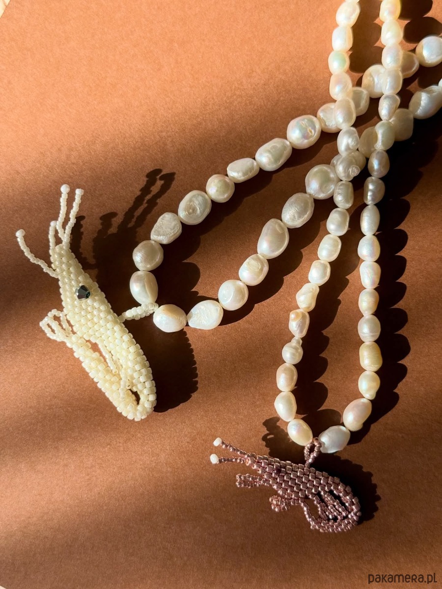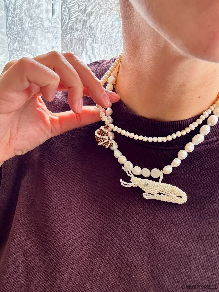 Naszyjnik typu choker wykonany z pereł hodowlanych w towarzystwie ręcznie uszytej krewetki z koralików szklanych toho.