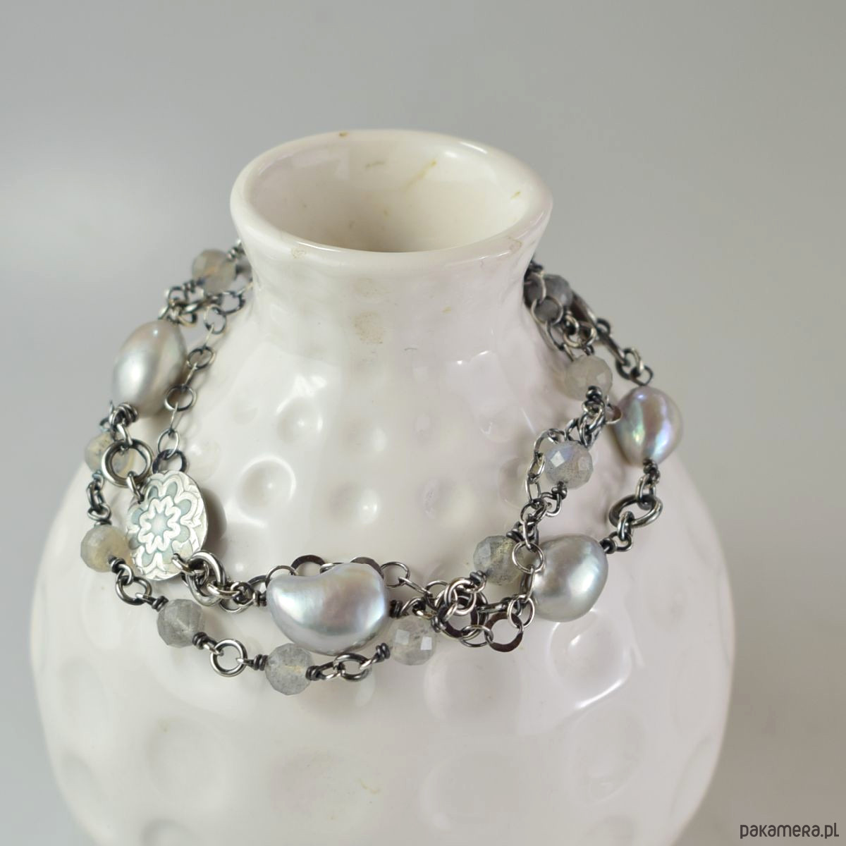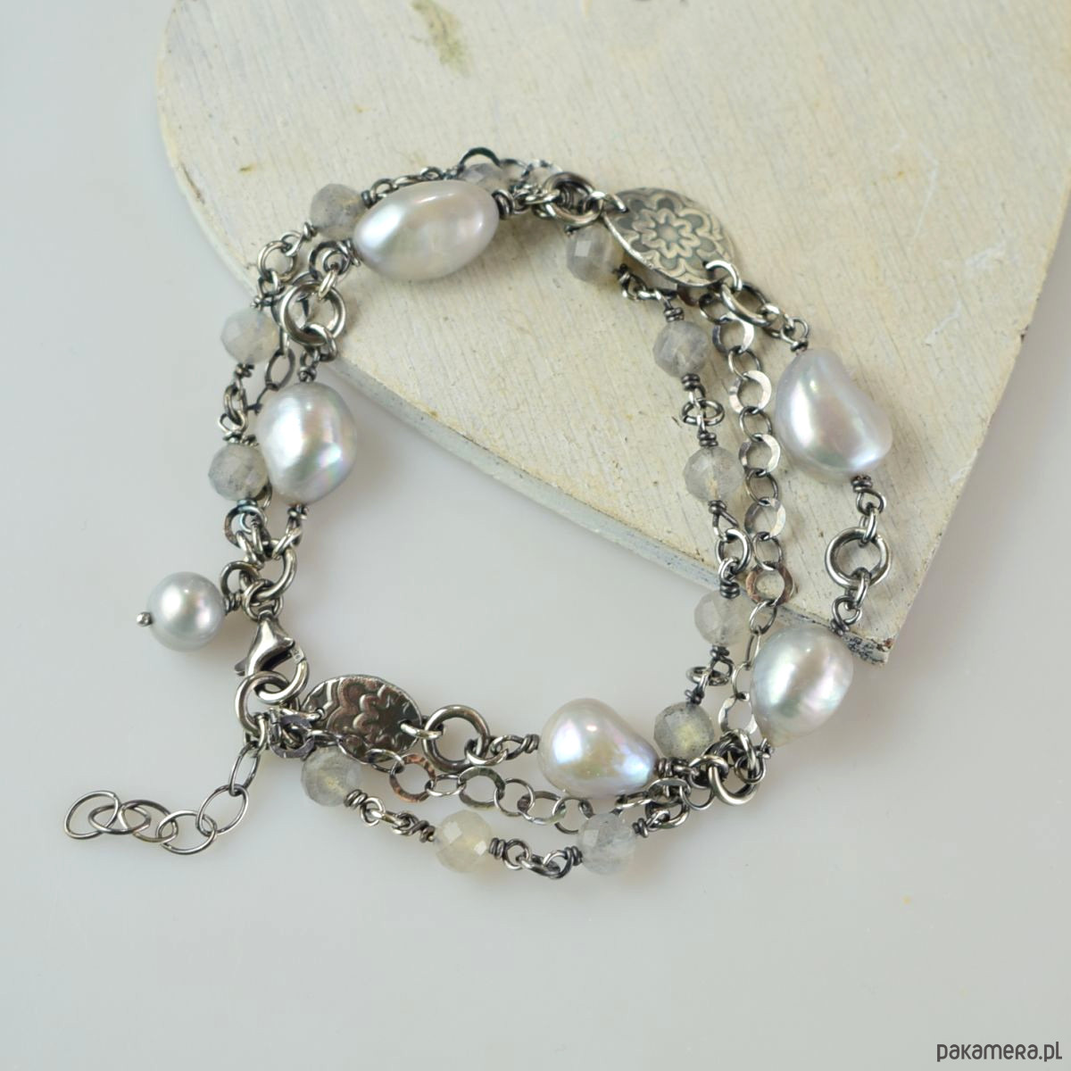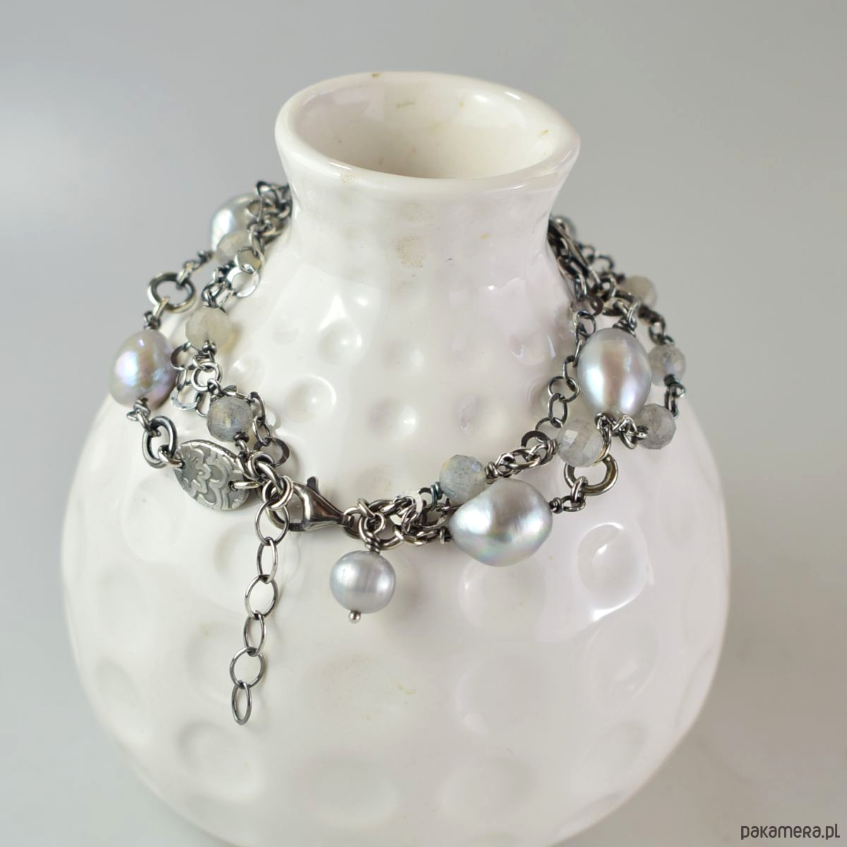 Bransoletka wykonana w całości ze srebra (próba 925) z szarymi perłami i labradorytem. Całość została zoksydowana (przyciemniona) i wypolerowana. Długość regulowana 20,5 - 23,5 cm. Biżuteria zostanie ozdobnie zapakowana.