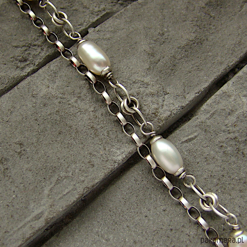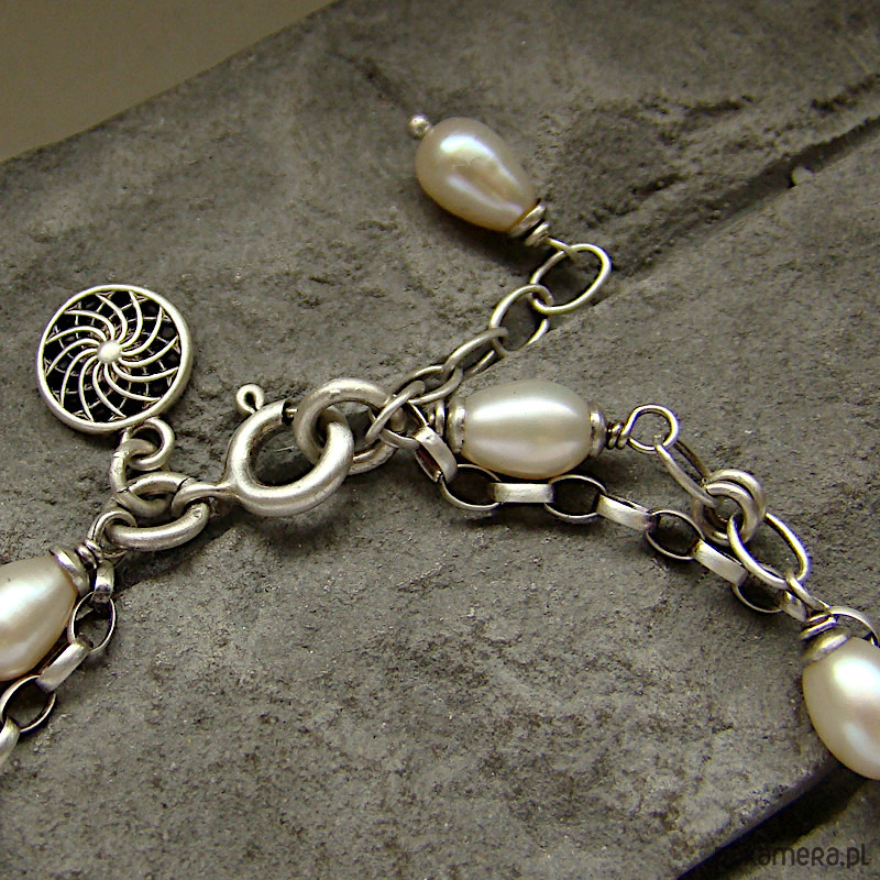 Delikatna, kobieca i wyjątkowa bransoletka na co dzień i nie tylko. Wykonana w całości z oksydowanego srebra próby 925 oraz bialych, naturalnych pereł slodkowodnych wielkości ok. 8 mm. Przy zapieciu filigranowa zawieszka rozeta. Całkowita długość bransoletki regulowana od 19 cm do 21 cm. Ozdobnie zapakowana.