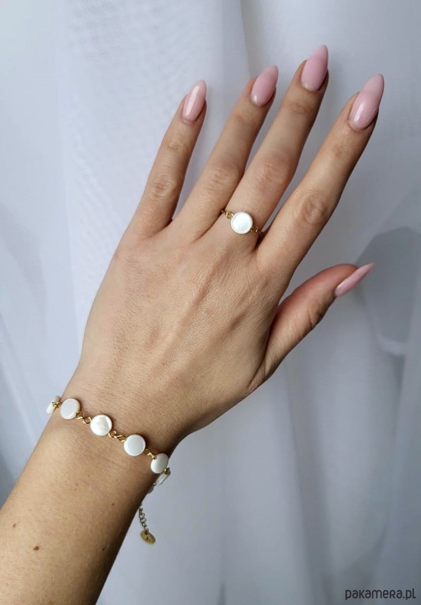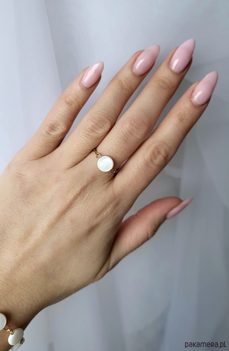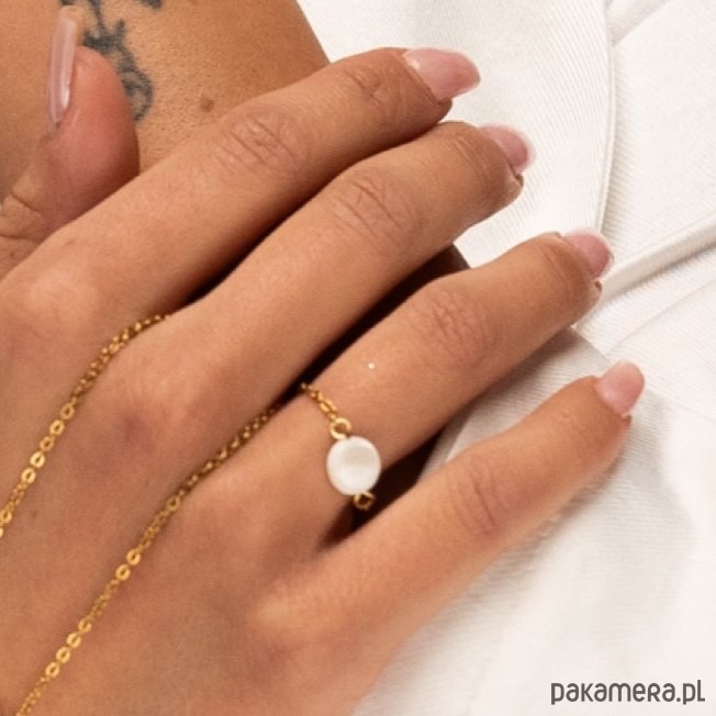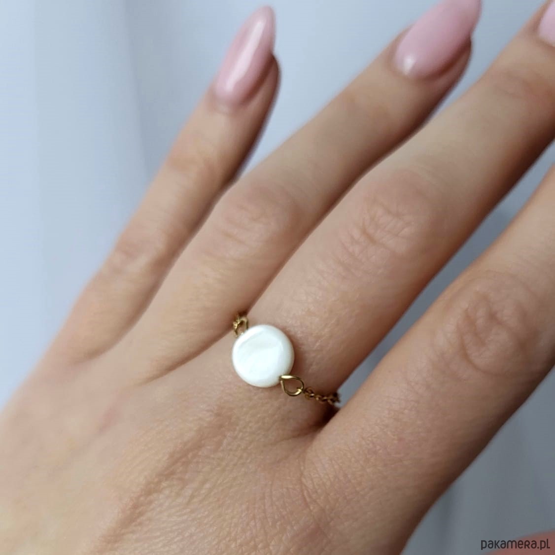 Pierścionek z pastylką masy perłowej w odcieniu bieli, wykonany ze stali szlachetnej, srebra pozłacanego oraz kółeczek mosiądzu pozłacanego 14-karatowym złotem, odpornych na ścieranie. Niestandardowo zapinany pierścionek na karabińczyk umożliwia regulację pierścionka, dzięki dodatkowej mini przedłużce (+ 1 cm), co umożliwia dopasowanie pierścionka do rozmiaru palca. Pierścionek prezentuje się elegancko i oryginalnie. Doskonale pasuje również do stylizacji boho.
