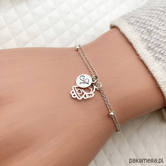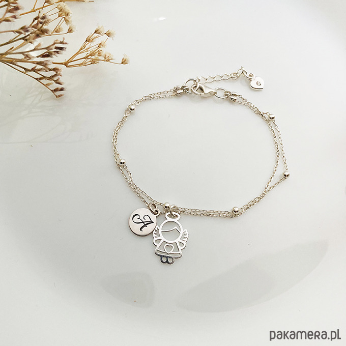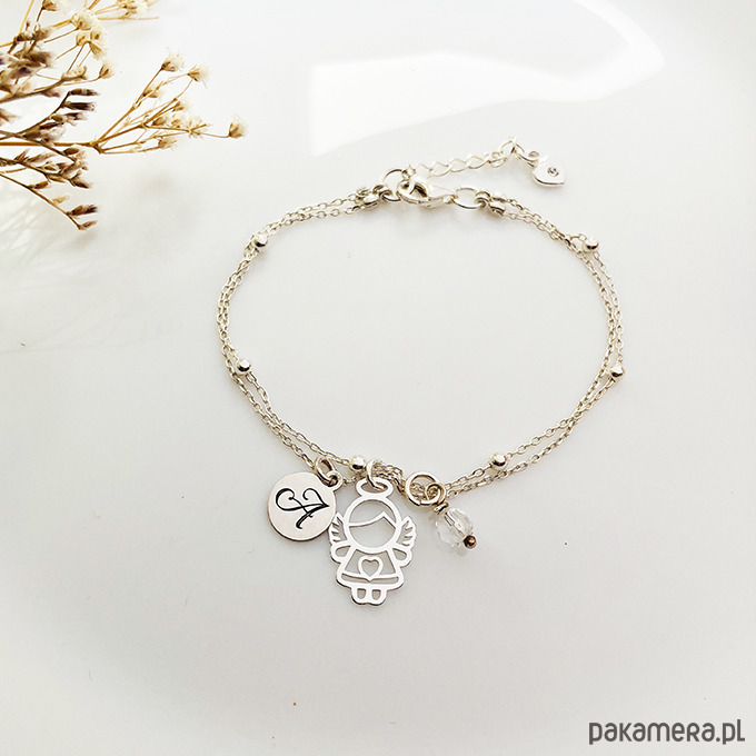 Wyjątkowy unikalny prezent z okazji Pierwszej Komunii, zawiera piękną ponadczasową bransoletkę na podwójnym łańcuszku wykonaną ze srebra 925 z grawerowaną zawieszką inicjałem, aniołkiem i z kryształkiem Swarovski , opcjonalnie z wykonaną ręcznie kartą z życzeniami.