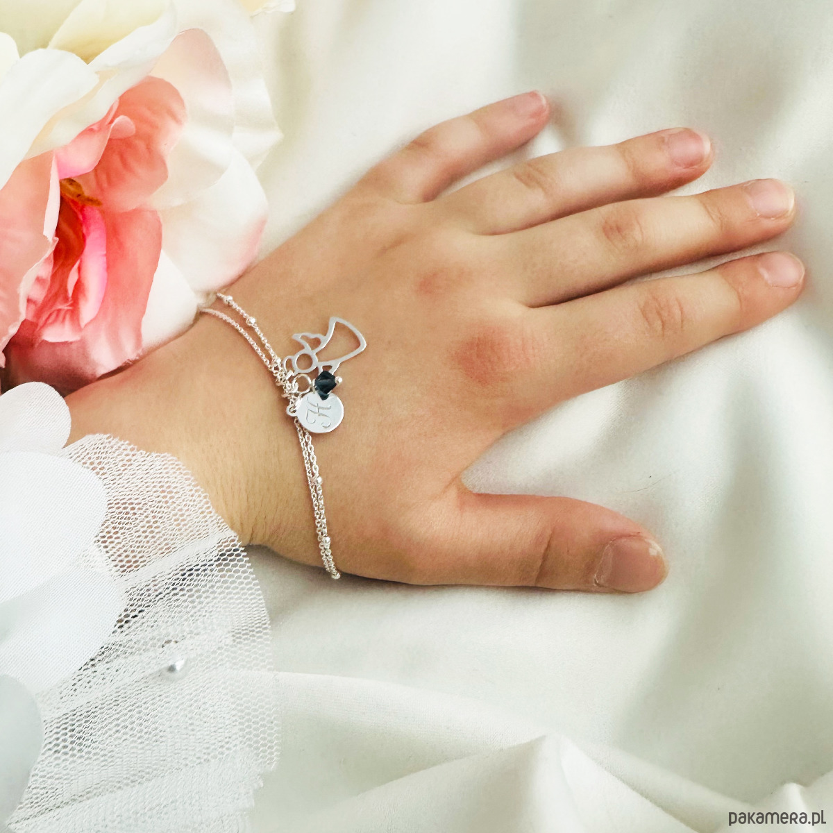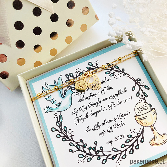 Wyjątkowy piękny prezent z okazji Pierwszej Komunii, zawiera ponadczasową bransoletkę na podwójnym łańcuszku wykonaną ze srebra 925 pozłacaną z grawerowaną zawieszką inicjałem oraz aniołkiem ( opcjonalnie z kryształkiem Swarovski i z wykonaną ręcznie kartą z życzeniami).