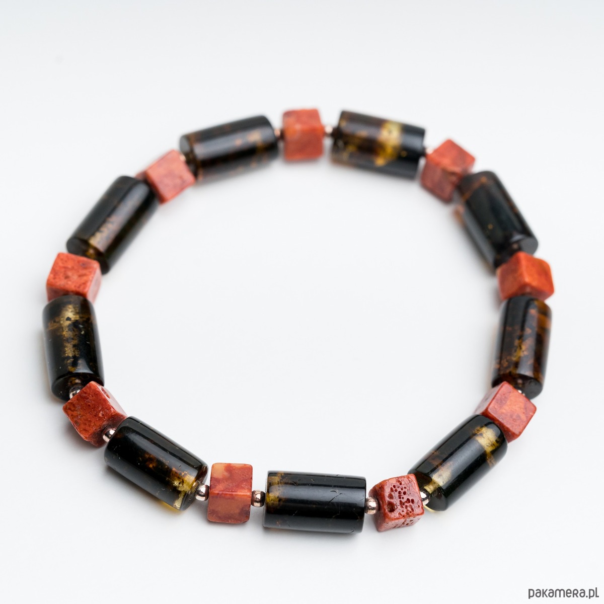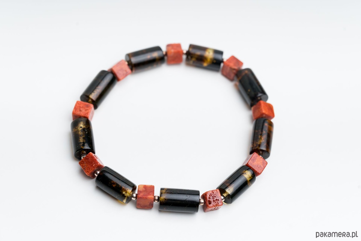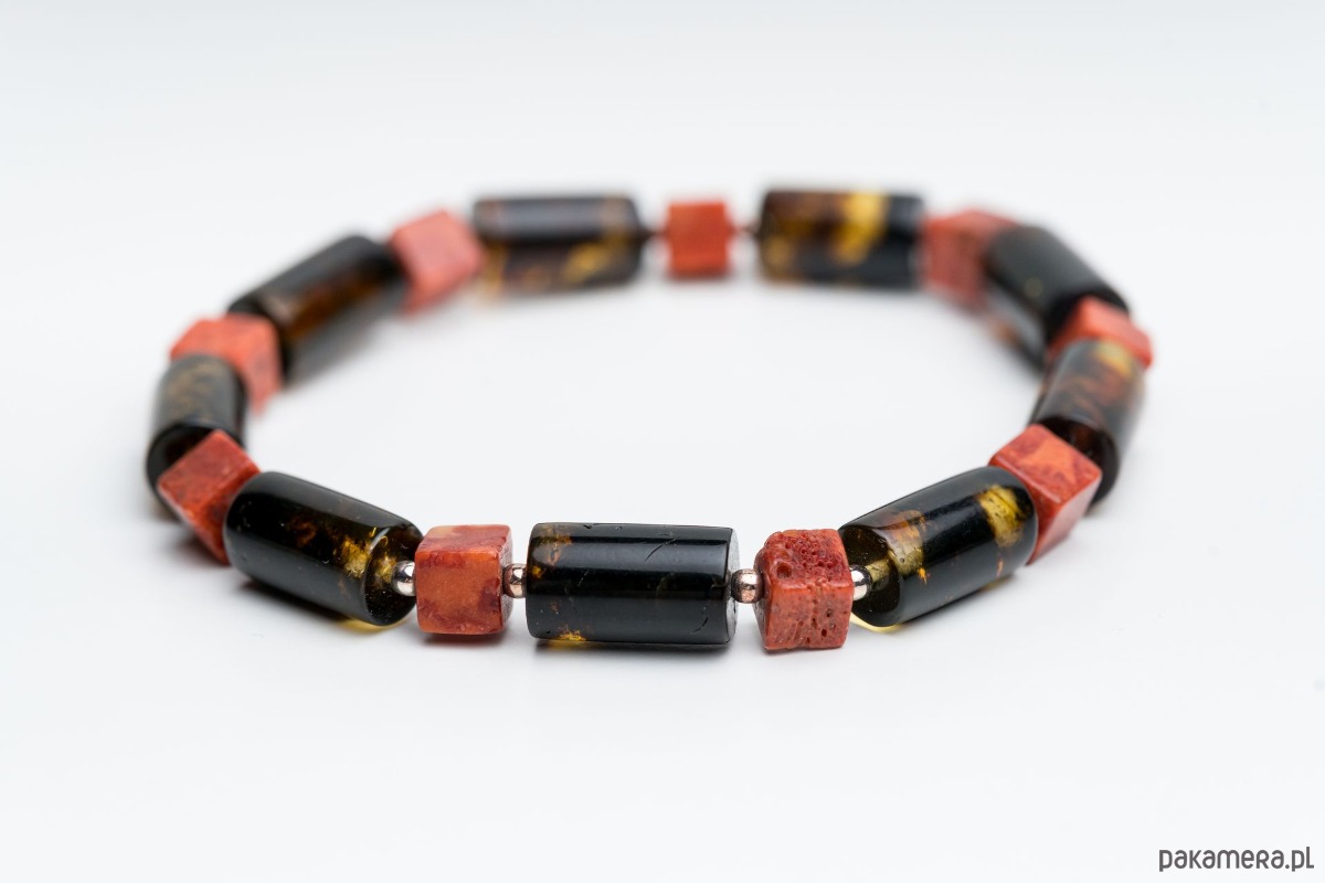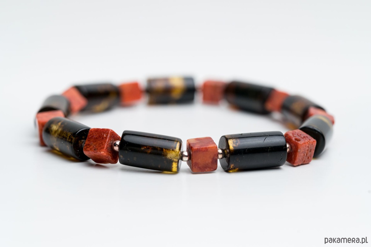 Minimalistyczna bransoletka męska wykonana z naturalnego bursztynu bałtyckiego. Bursztynowe wałki w kolorze czarnym i koralowa kostka tworzą wyrazistą, a jednocześnie elegancką kompozycję. Kontrast głębokiej czerni z klasycznym koniakowym bursztynem nadaje biżuterii nowoczesny, ponadczasowy charakter.