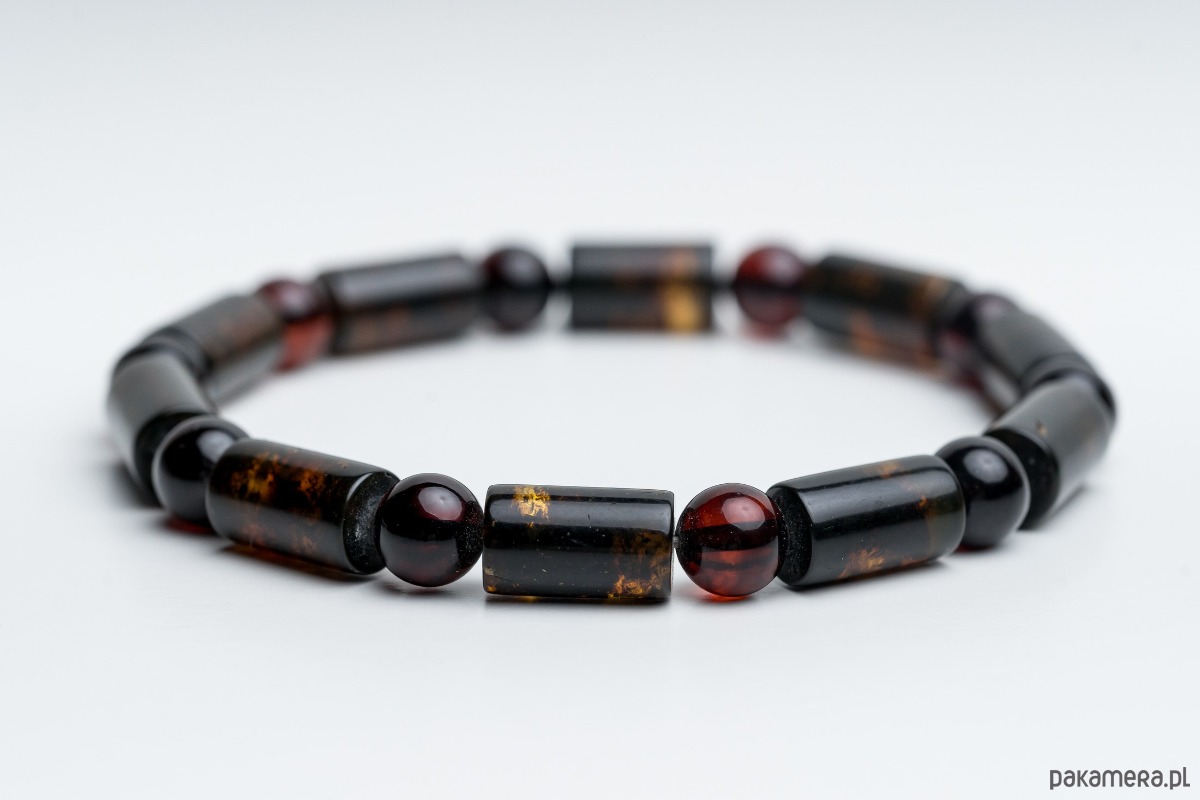 Minimalistyczna bransoletka męska wykonana z naturalnego bursztynu bałtyckiego w kolorze czarnym i mlecznym. Bursztynowe wałki i regularna kulka tworzą wyrazistą, a jednocześnie elegancką kompozycję. Kontrast głębokiej czerni z jasnym, zielonym bursztynem nadaje biżuterii nowoczesny, ponadczasowy charakter.
