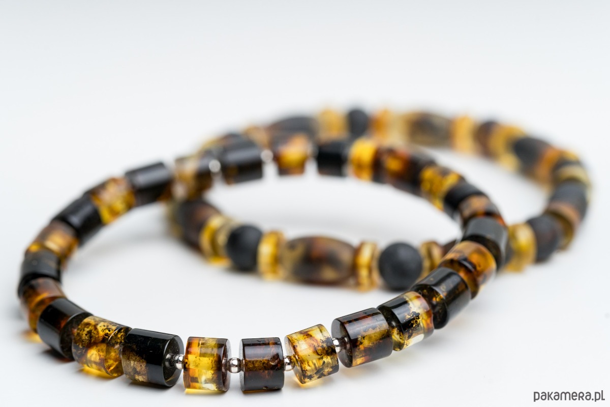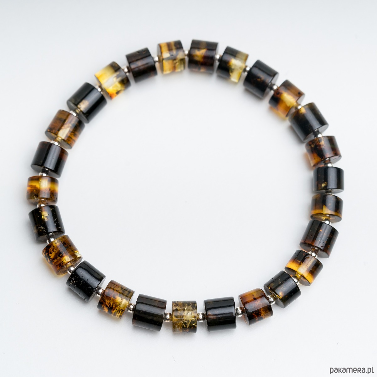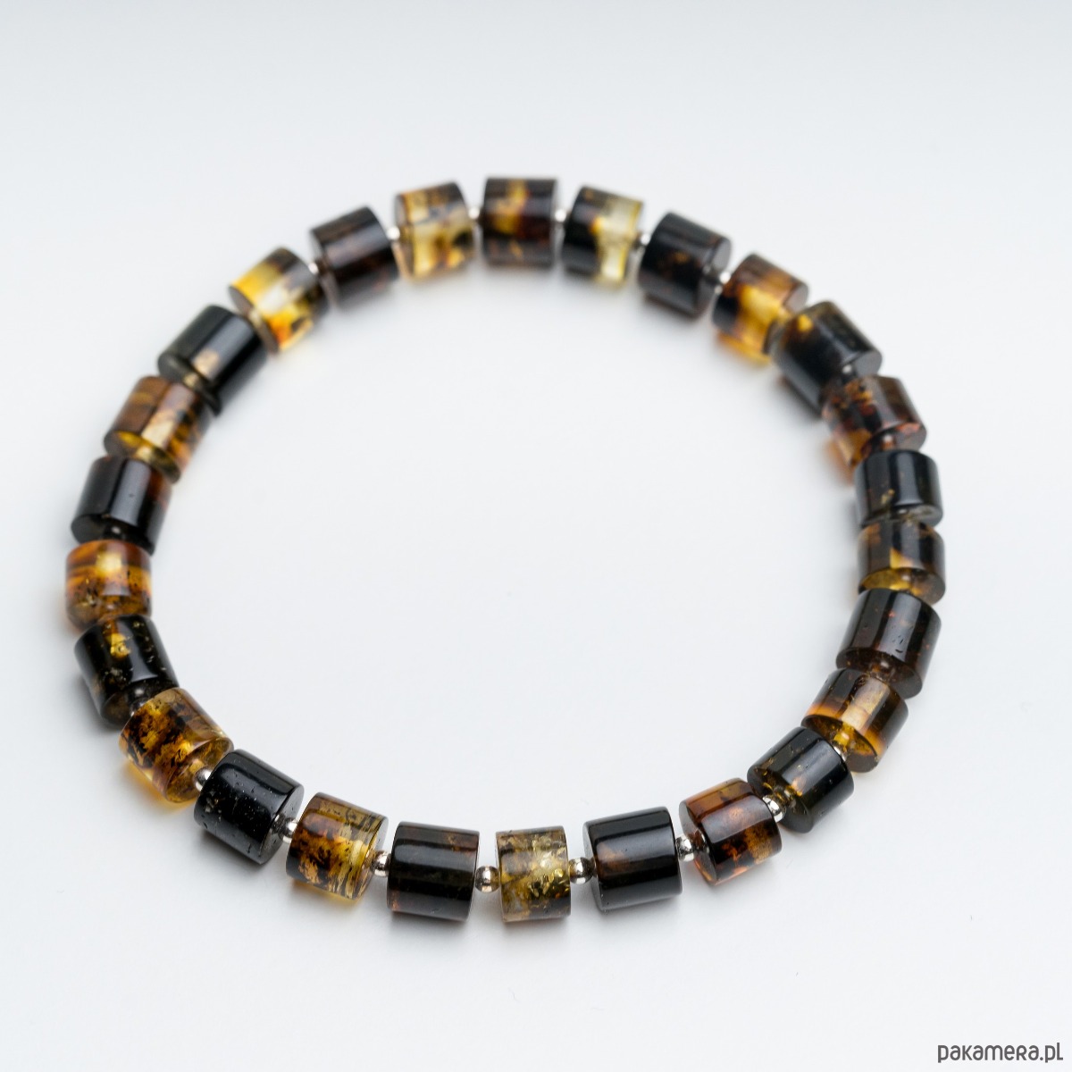 Minimalistyczna bransoletka męska wykonana z naturalnego bursztynu bałtyckiego w kolorze czarnym i mlecznym. Bursztynowe wałki tworzą wyrazistą, a jednocześnie elegancką kompozycję. Kontrast głębokiej czerni z jasnym, zielonym bursztynem nadaje biżuterii nowoczesny, ponadczasowy charakter.