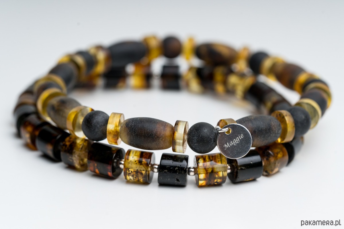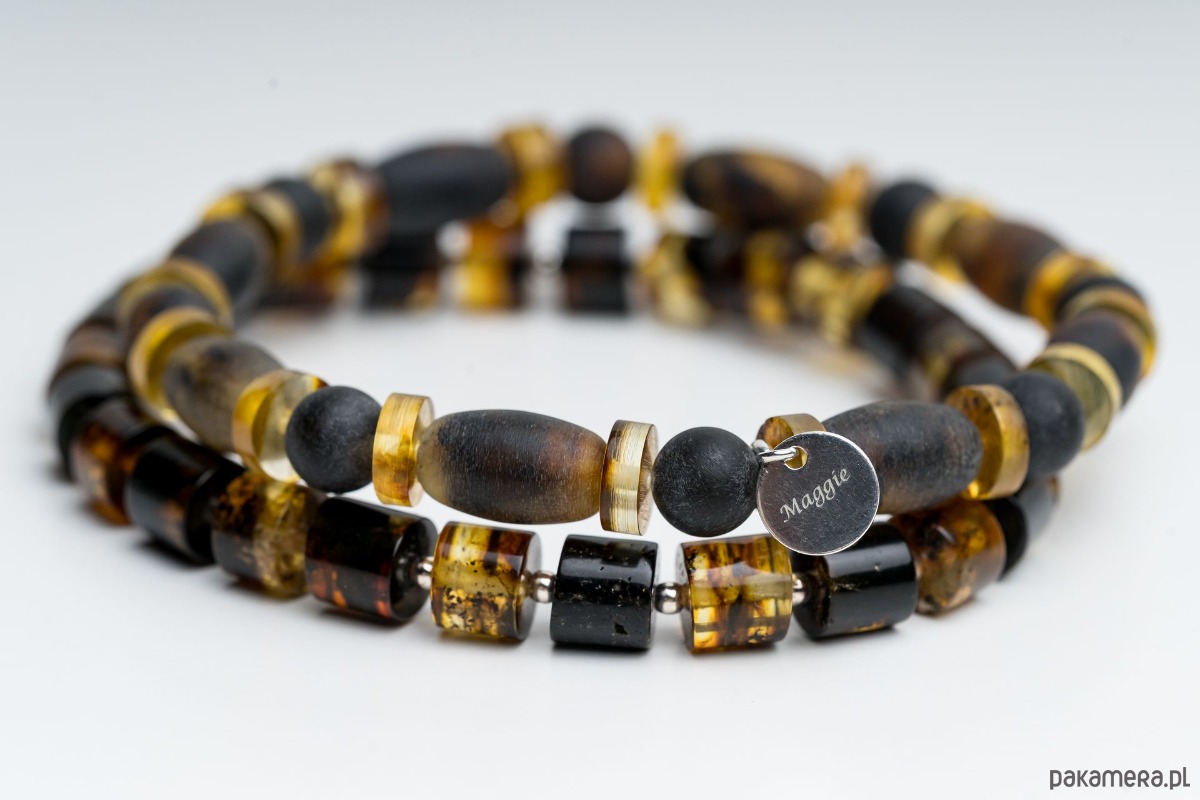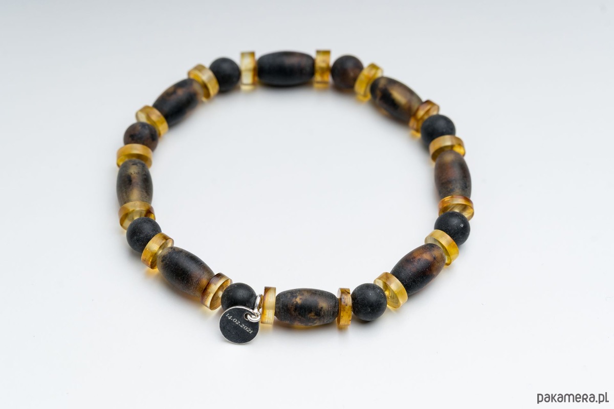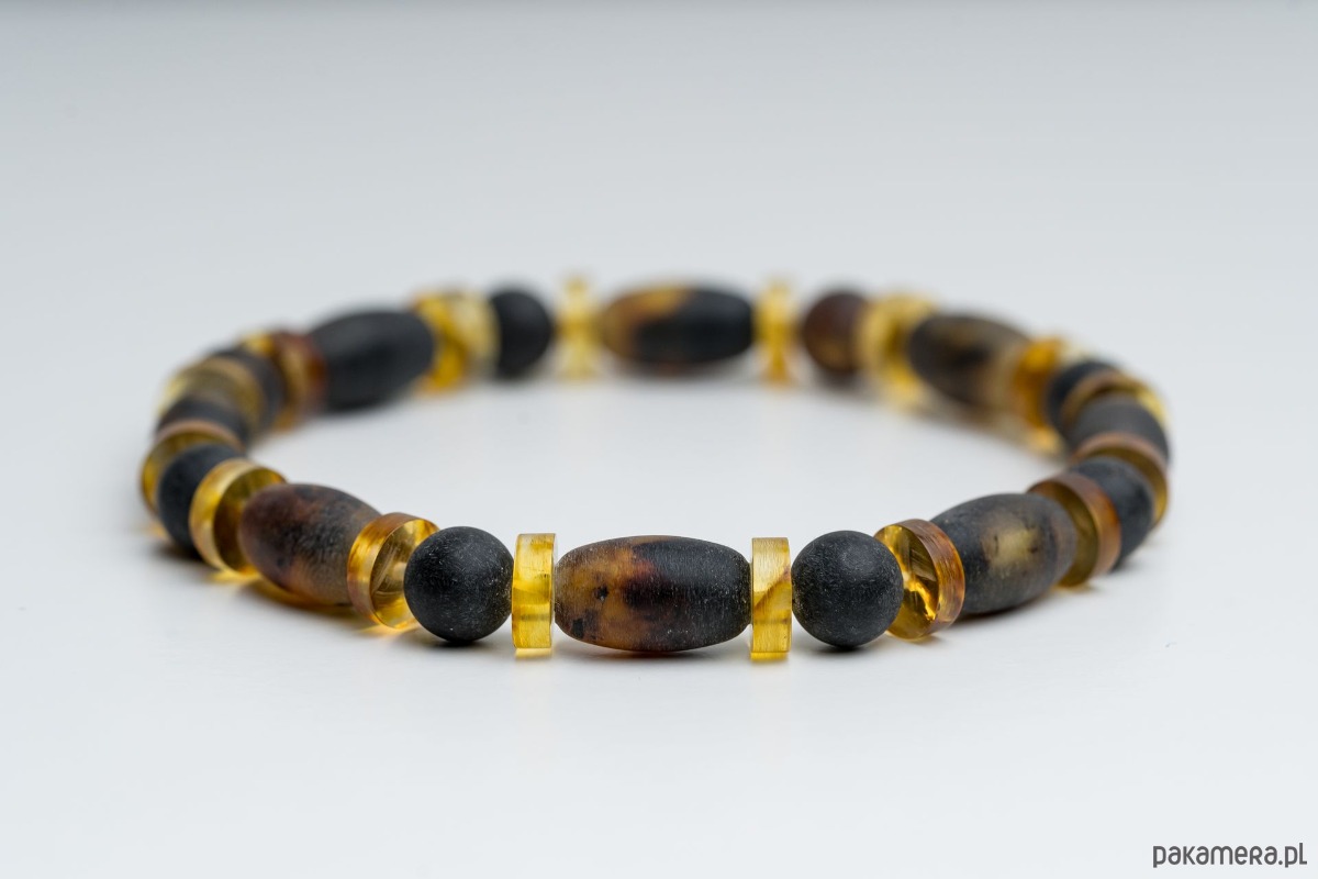 Minimalistyczna bransoletka męska wykonana z naturalnego bursztynu bałtyckiego w kolorze czarnym i mlecznym. Bursztynowe beczułki i dyski tworzą wyrazistą, a jednocześnie elegancką kompozycję. Kontrast głębokiej czerni z jasnym, zielonym bursztynem nadaje biżuterii nowoczesny, ponadczasowy charakter.
