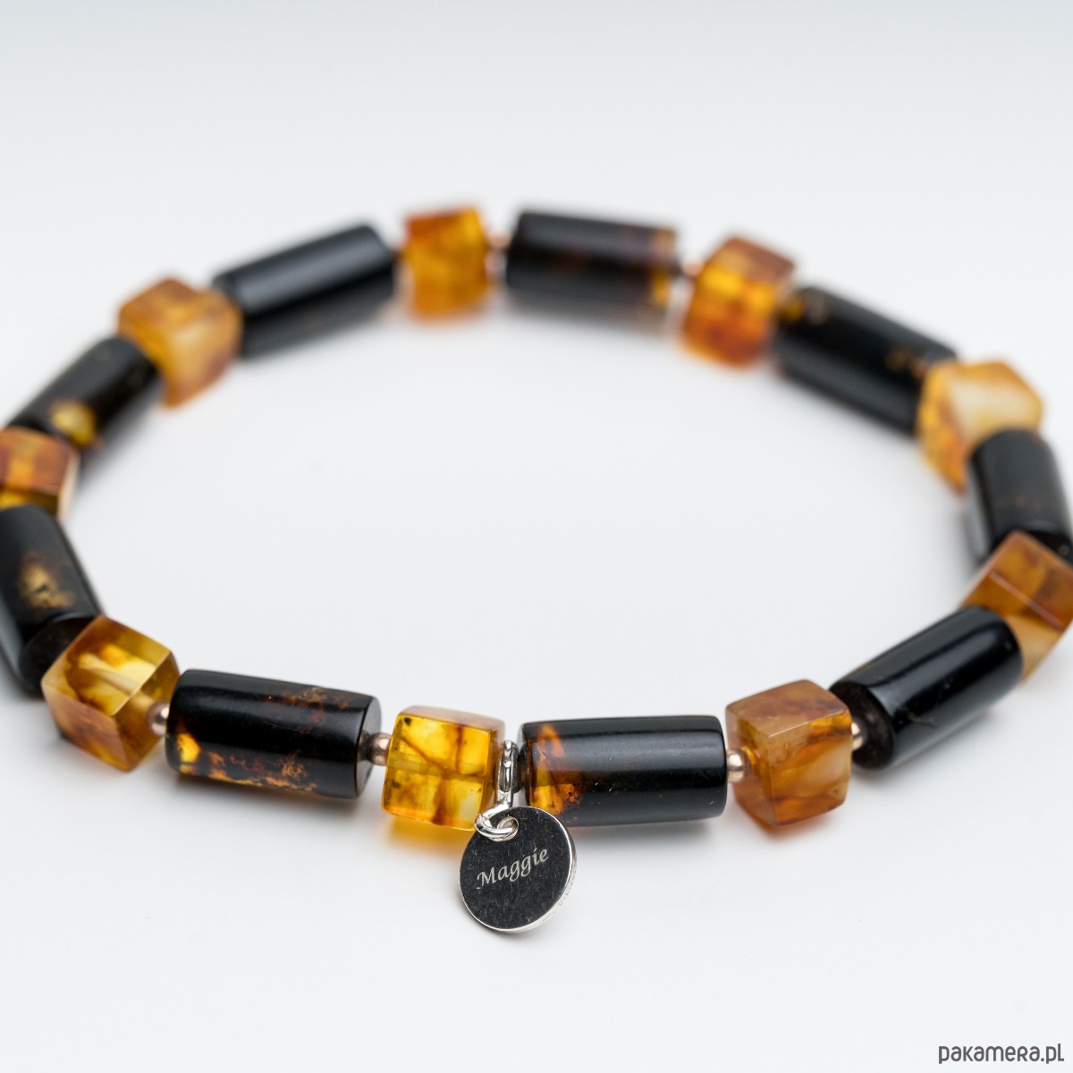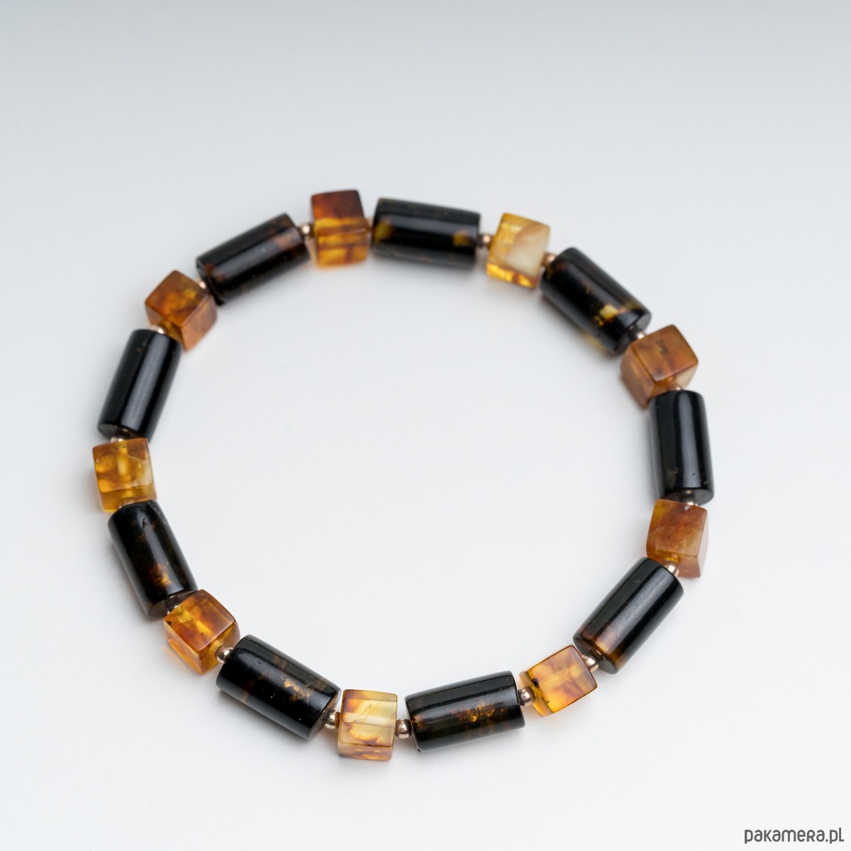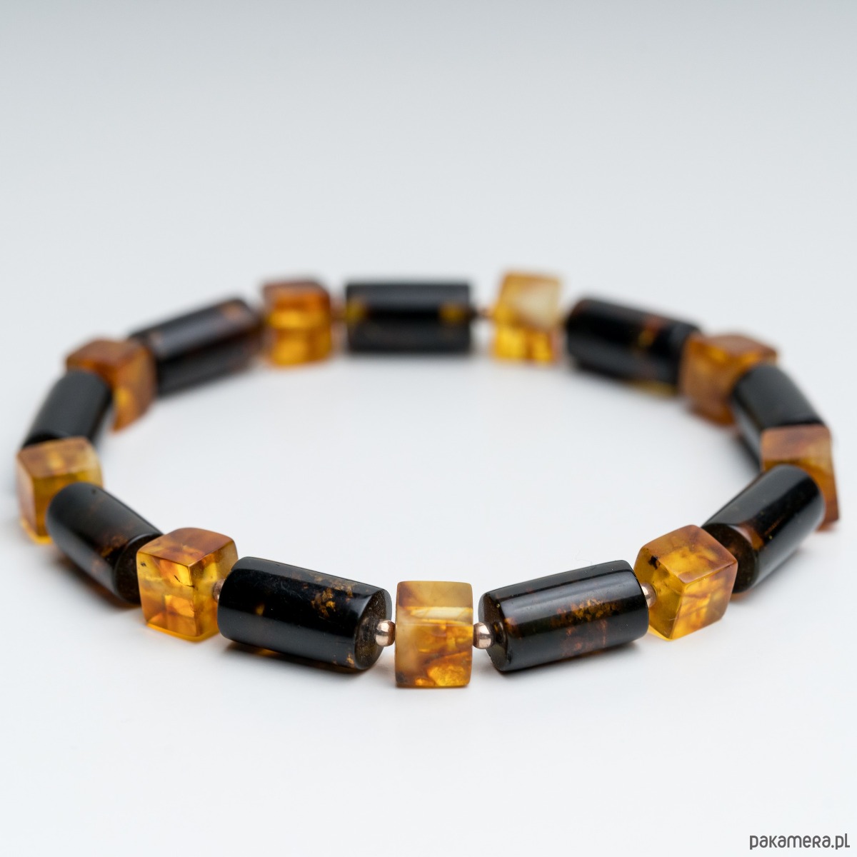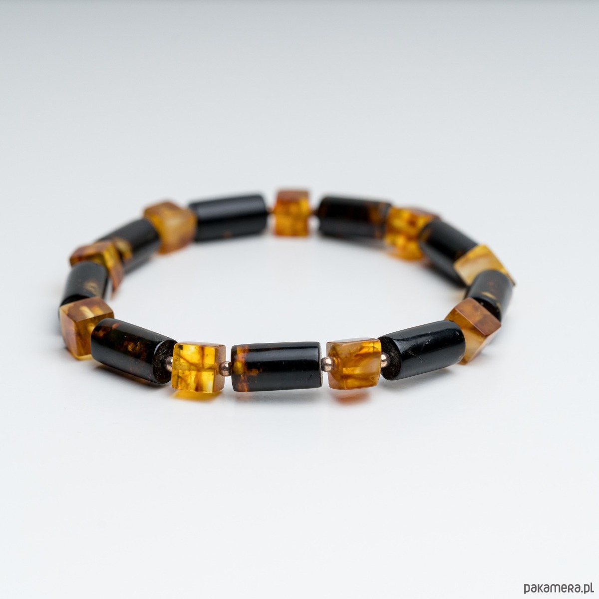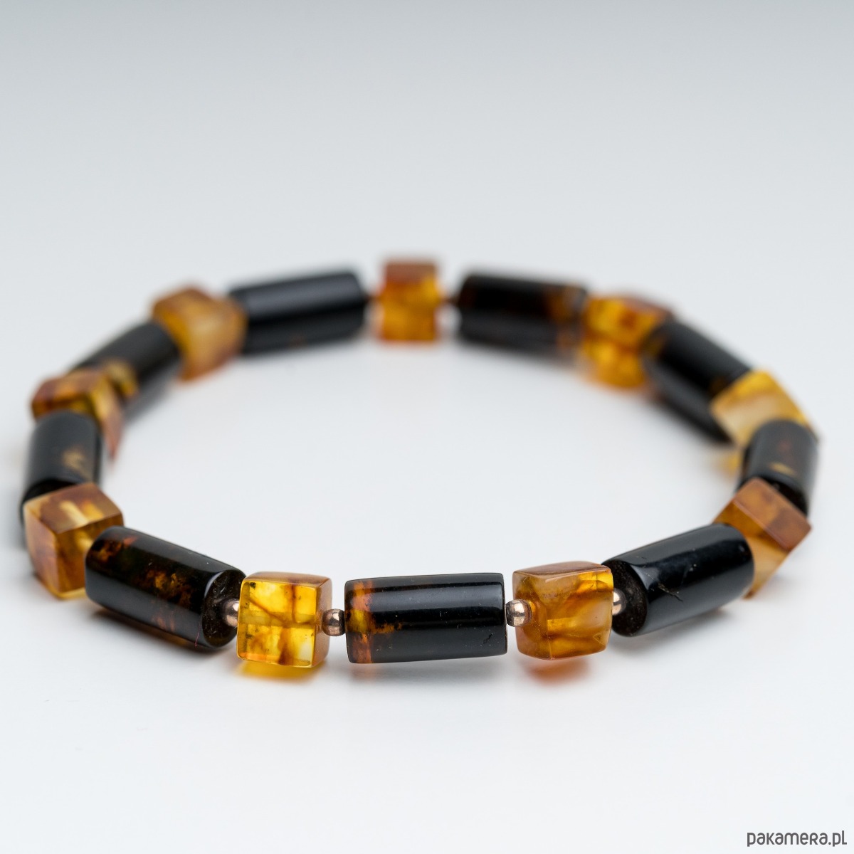 Minimalistyczna bransoletka męska wykonana z naturalnego bursztynu bałtyckiego w kolorze czarnym i mlecznym. Bursztynowe wałki w kolorze czarnym i koniakowa kostka tworzą wyrazistą, a jednocześnie elegancką kompozycję. Kontrast głębokiej czerni z klasycznym koniakowym bursztynem nadaje biżuterii nowoczesny, ponadczasowy charakter.