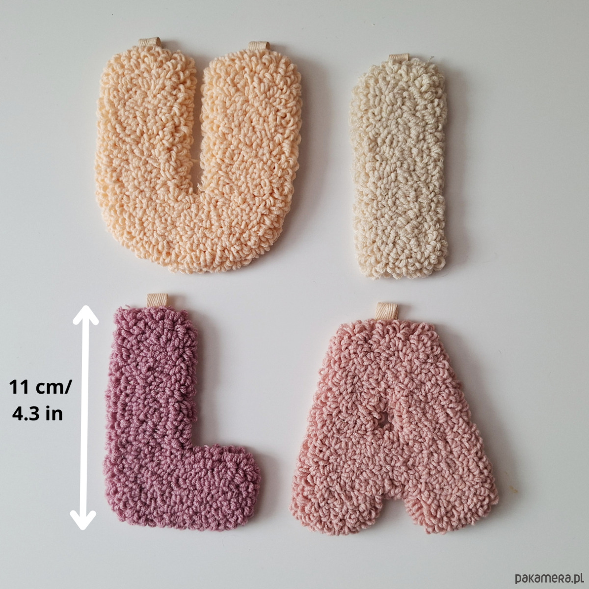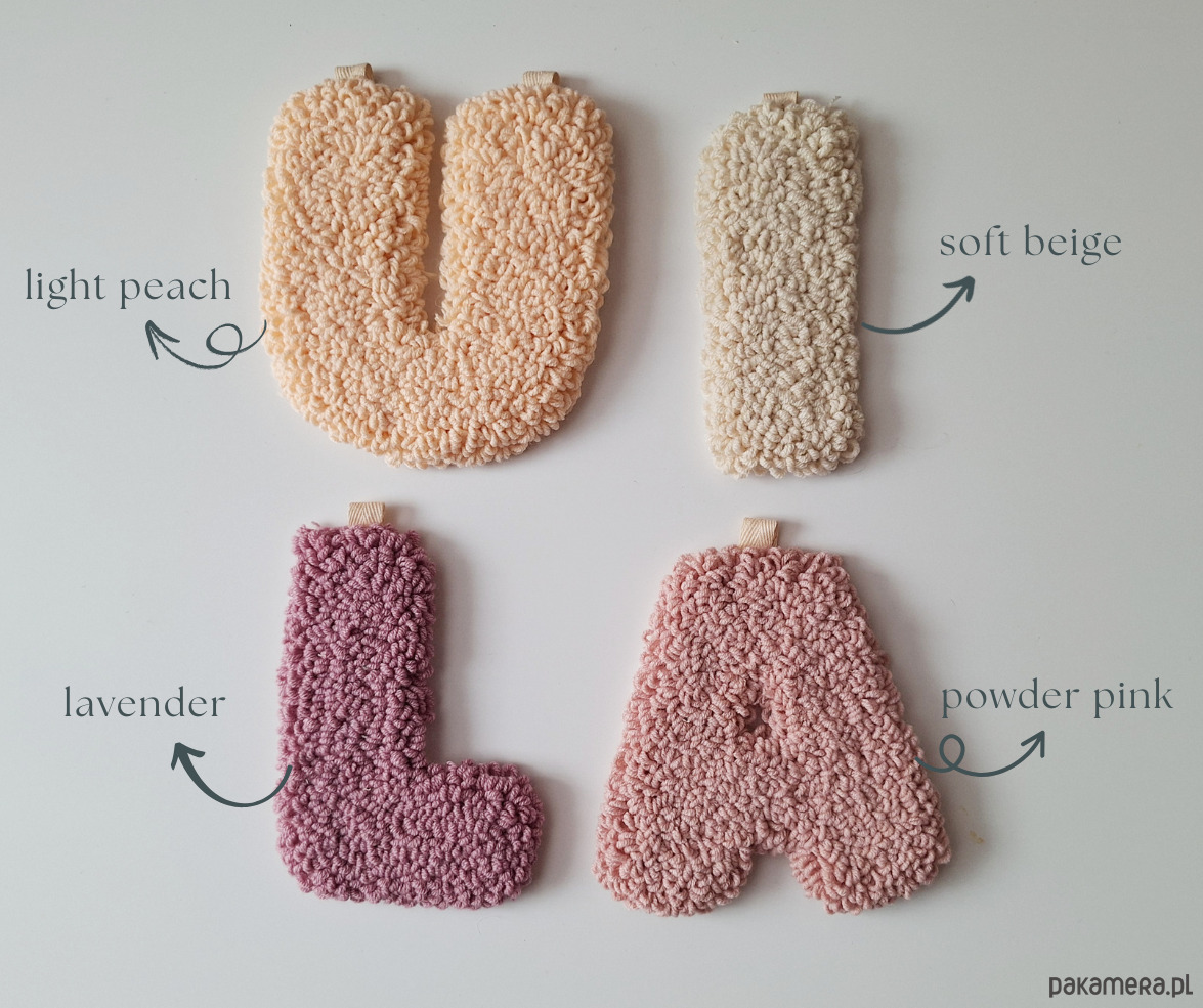Każda literka wykonana jest w harmonijnej palecie kolorów: pudrowy róż, jasna brzoskwinia, wrzos oraz jasny beż- dokładnie w takiej kolejności, jak na zdjęciach.
