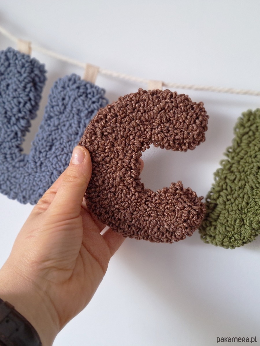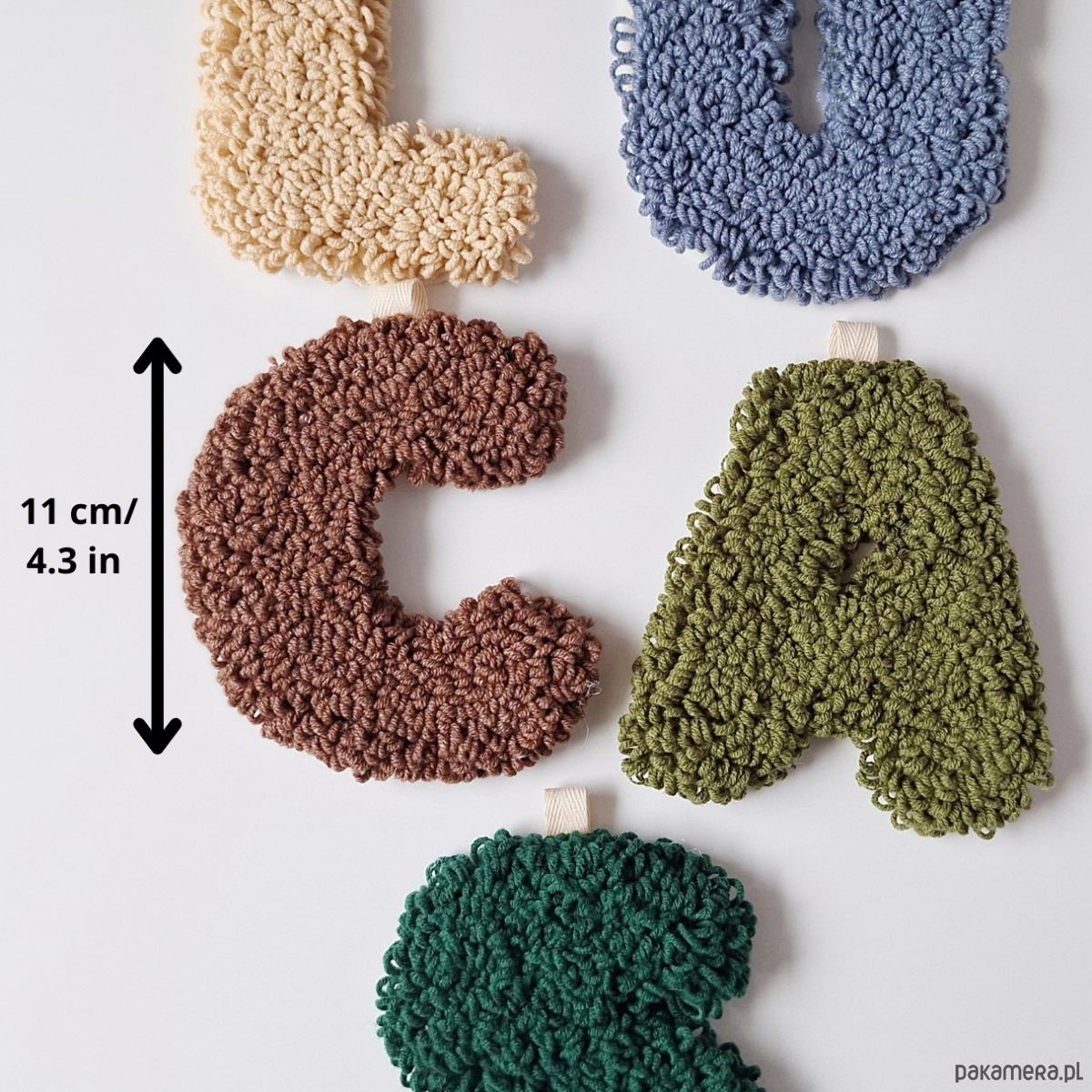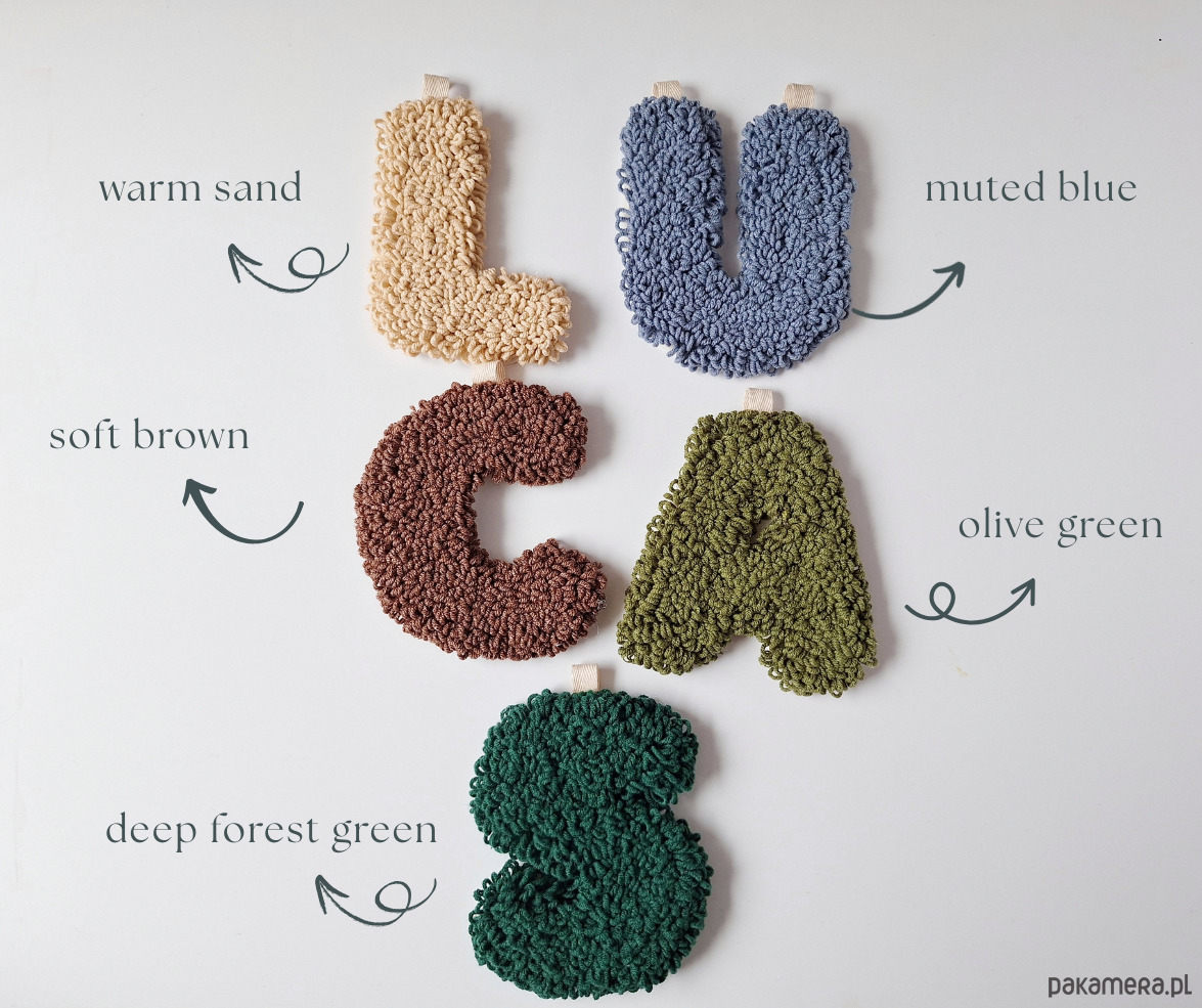 Każda literka wykonana jest w starannie dobranej, ziemistej palecie kolorów inspirowanej naturą: ciepły piaskowy, zgaszony niebieski, delikatny brąz, oliwkowa zieleń oraz głęboka zieleń – dokładnie w tej kolejności, jak na zdjęciach.