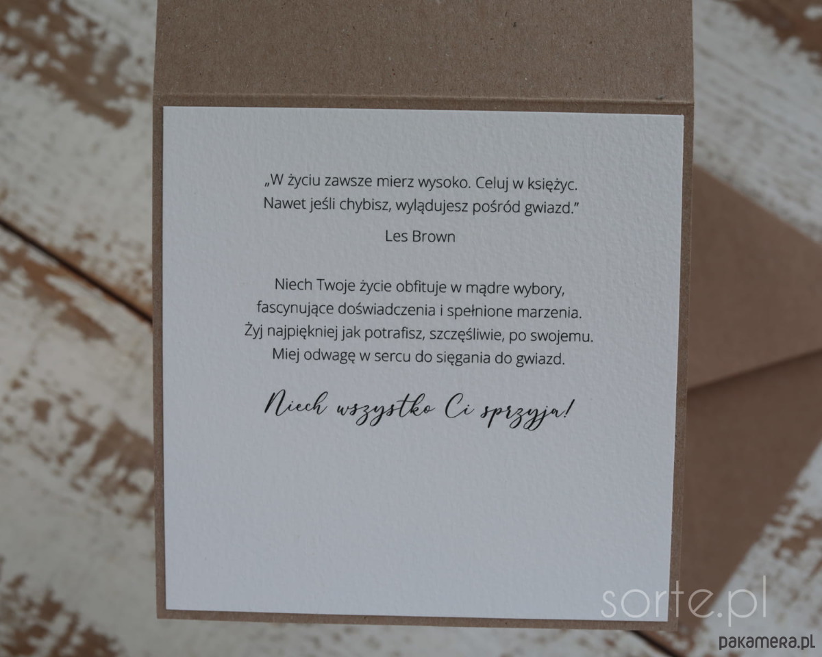 Kartka o wymiarach 14x14 cm w zestawie z brązową kopertą.