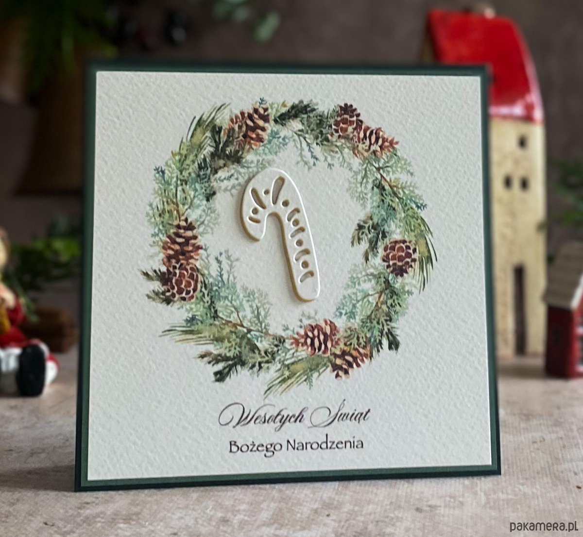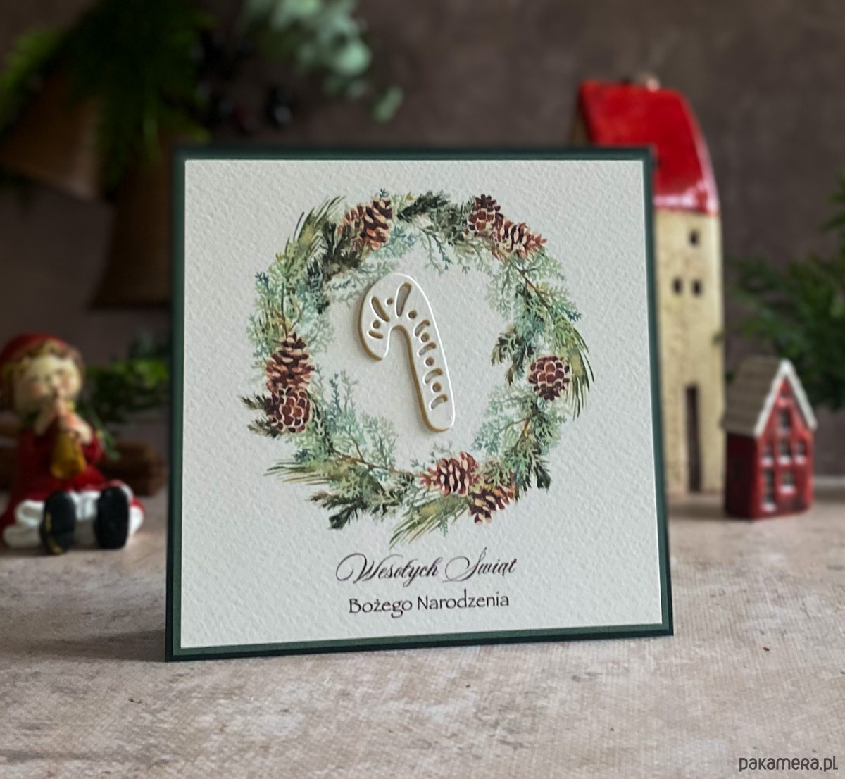 Zestaw z graficznym świątecznym wiankiem, ręcznie wyciętym dekorem oraz kolorystycznie dopasowaną kopertą.