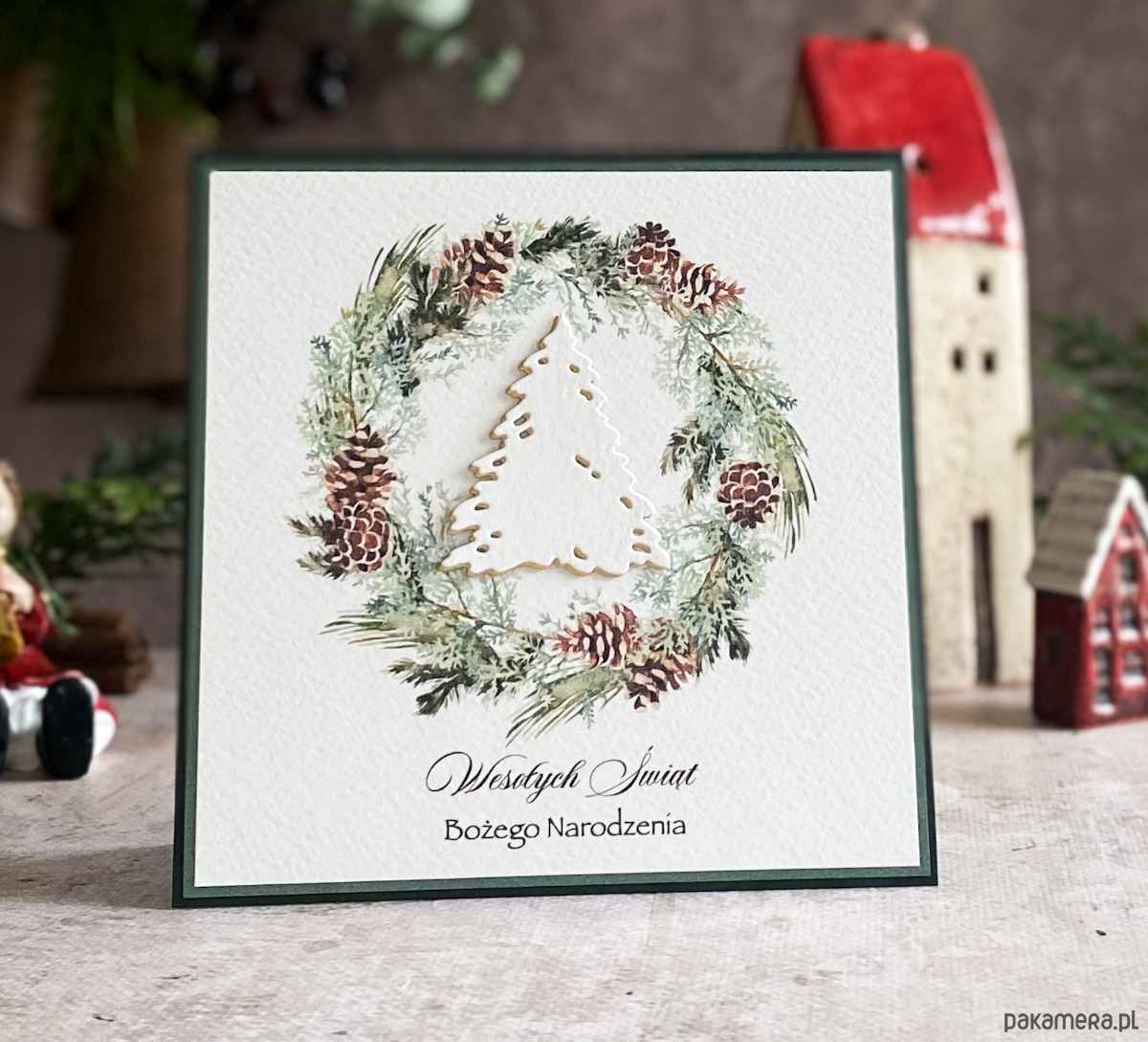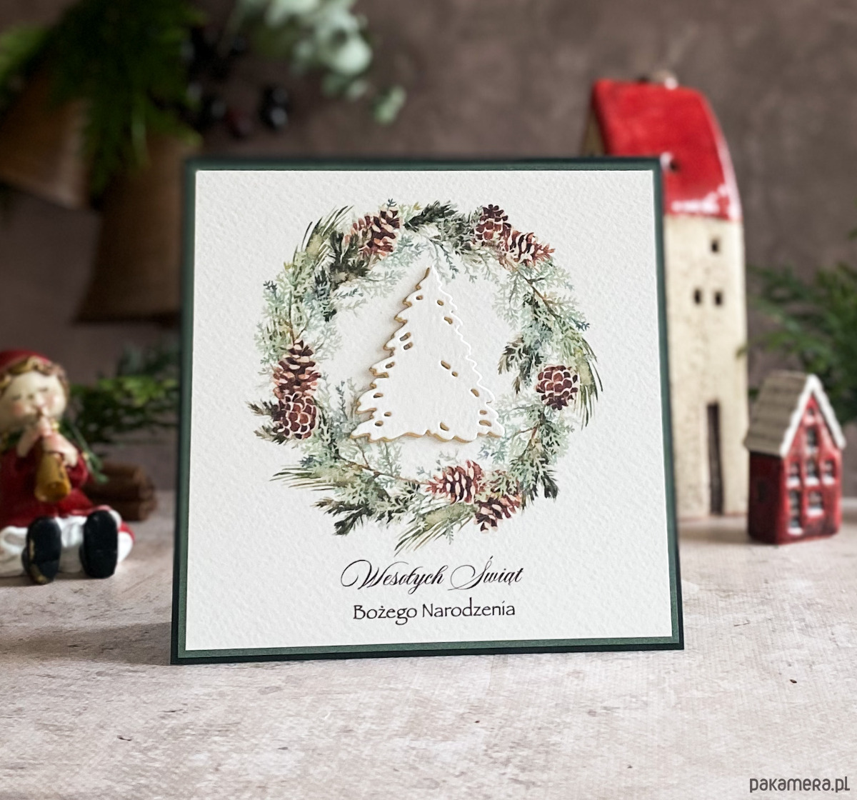 Zestaw z graficznym świątecznym wiankiem, ręcznie wyciętym dekorem oraz kolorystycznie dopasowaną kopertą.