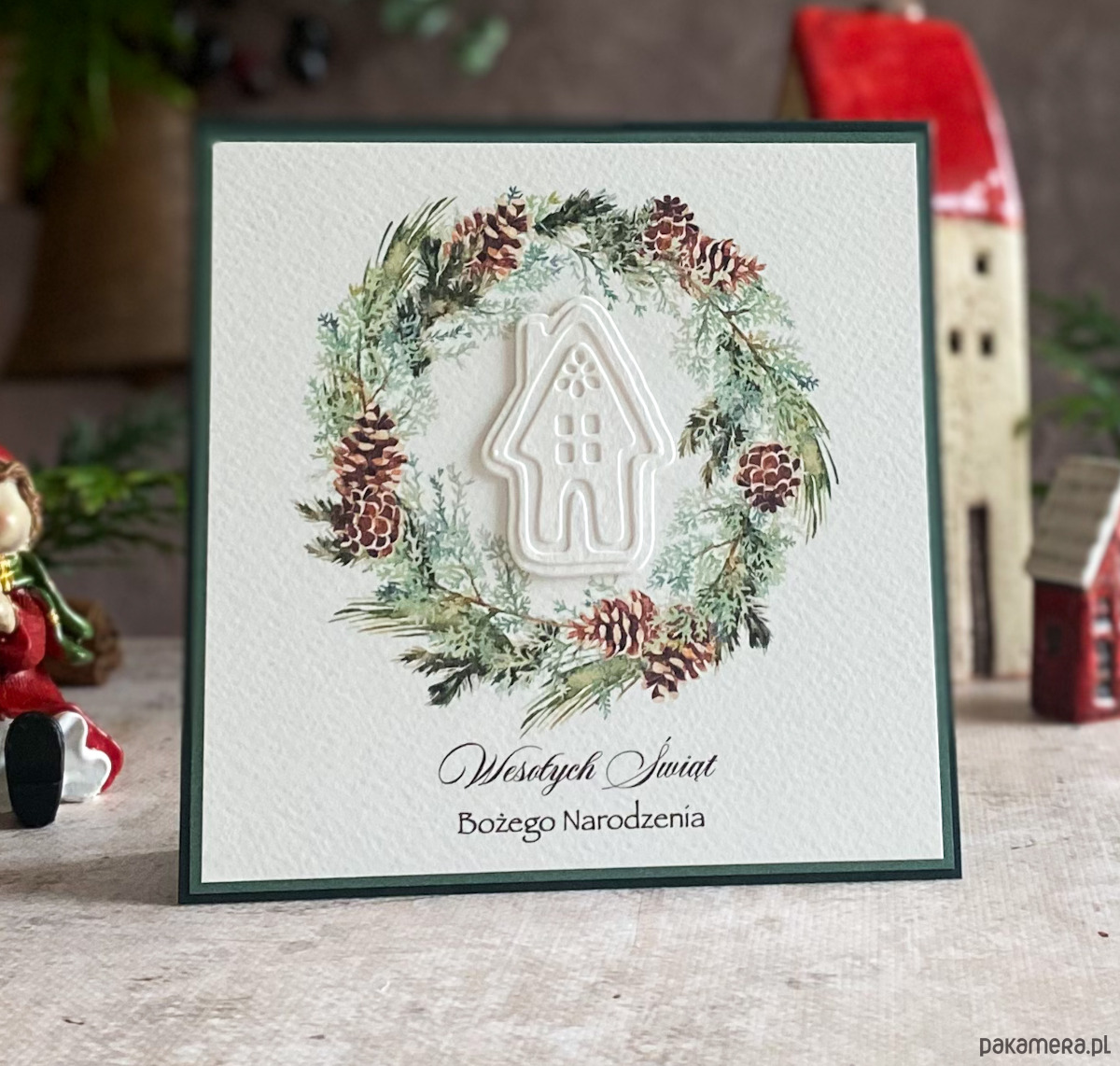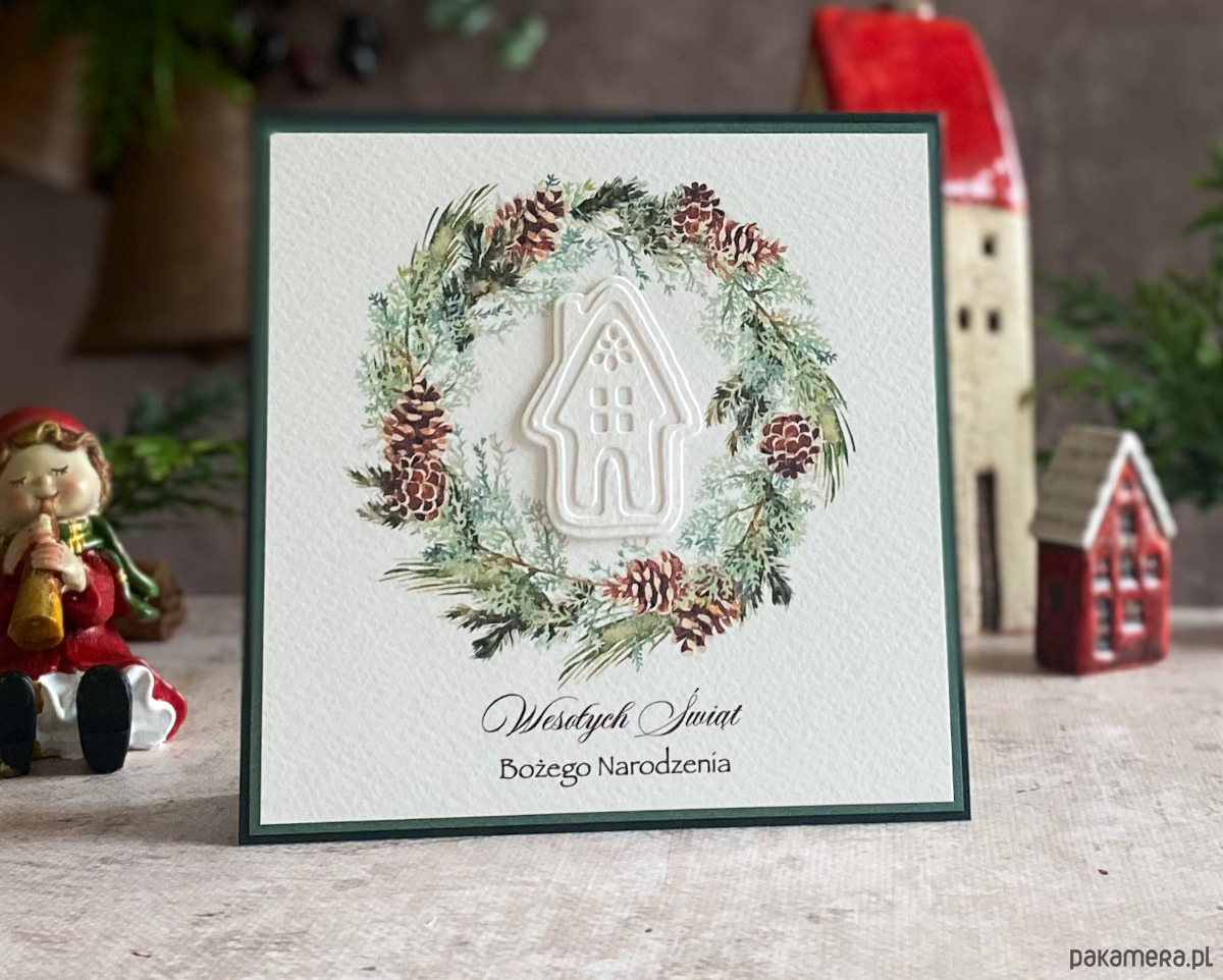 Zestaw z graficznym świątecznym wiankiem, ręcznie wyciętym dekorem oraz kolorystycznie dopasowaną kopertą.