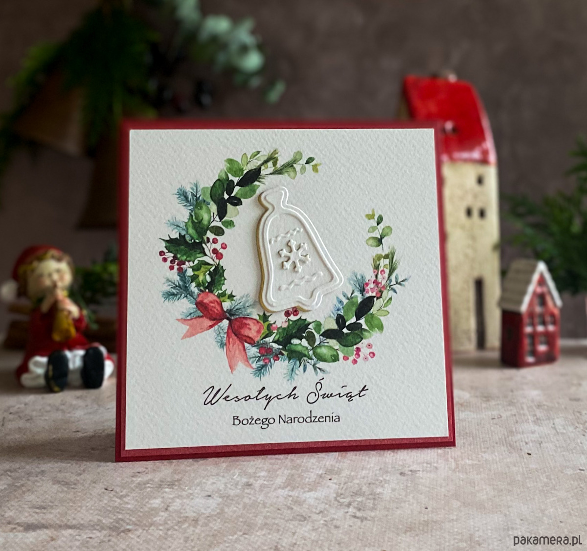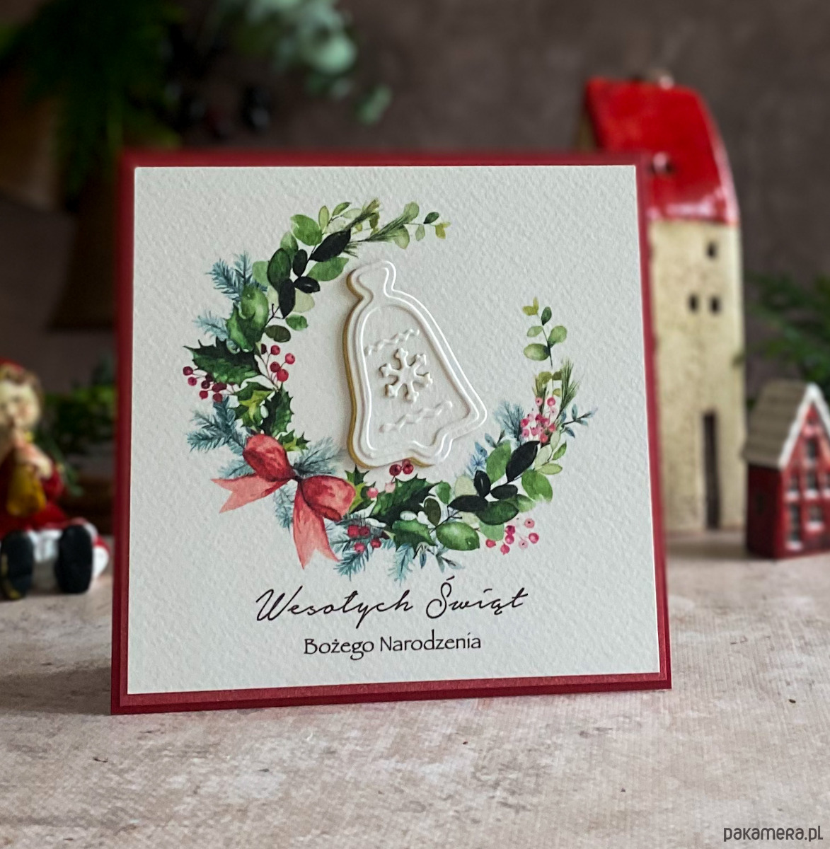 Zestaw z graficznym świątecznym wiankiem, ręcznie wyciętym dekorem oraz kolorystycznie dopasowaną kopertą.
