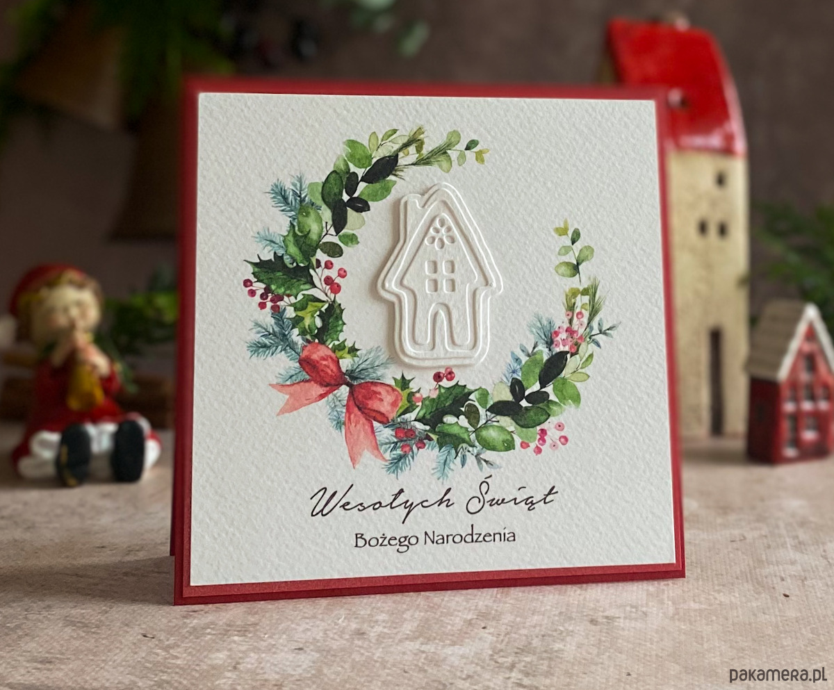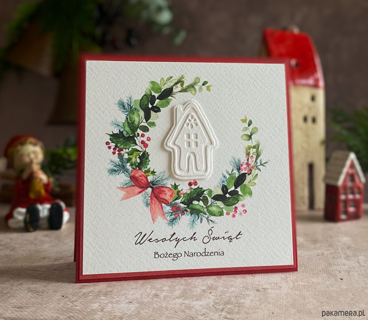 Zestaw z graficznym świątecznym wiankiem, ręcznie wyciętym dekorem oraz kolorystycznie dopasowaną kopertą.