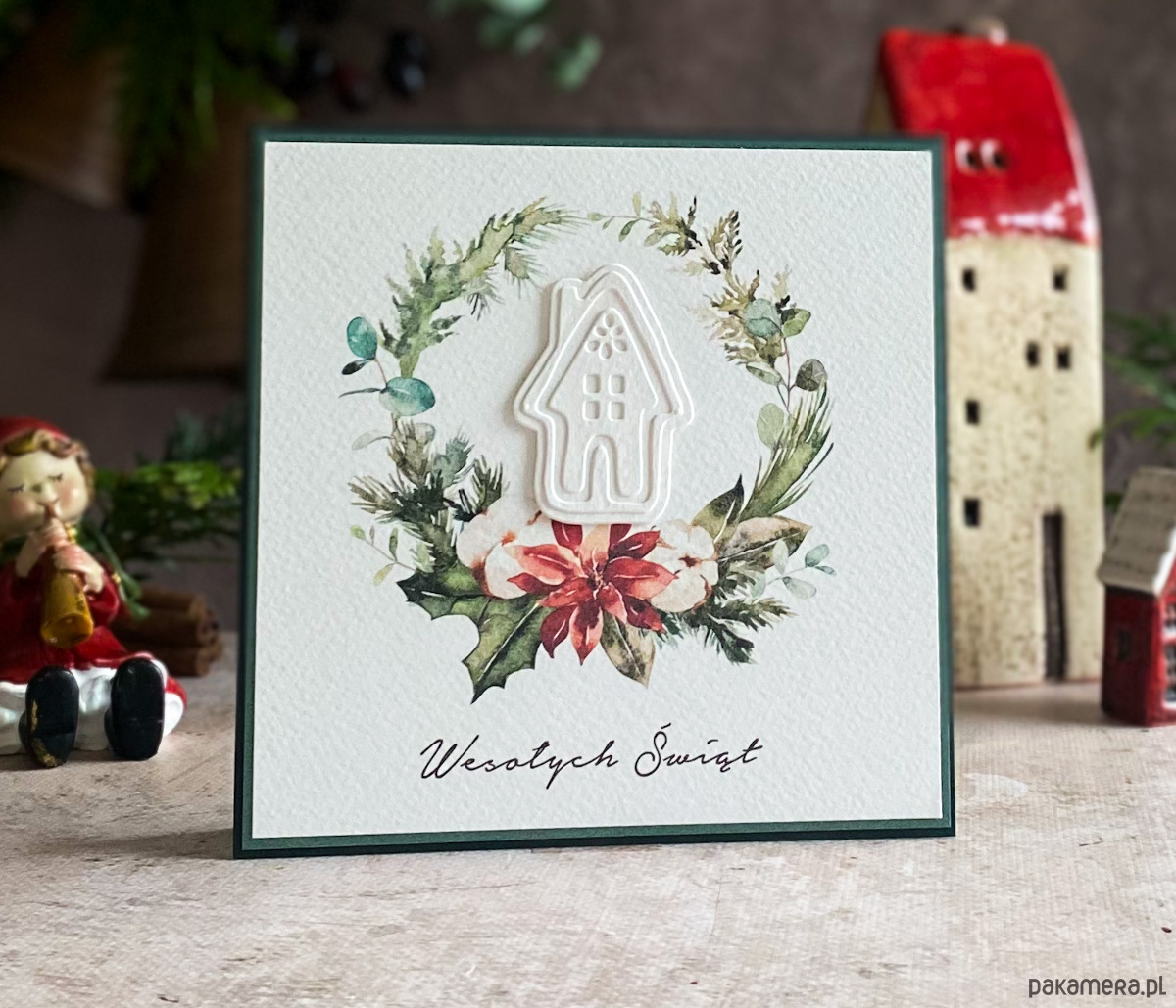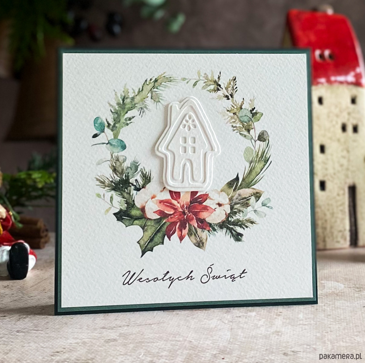Zestaw z graficznym świątecznym wiankiem, ręcznie wyciętym dekorem oraz kolorystycznie dopasowaną kopertą.