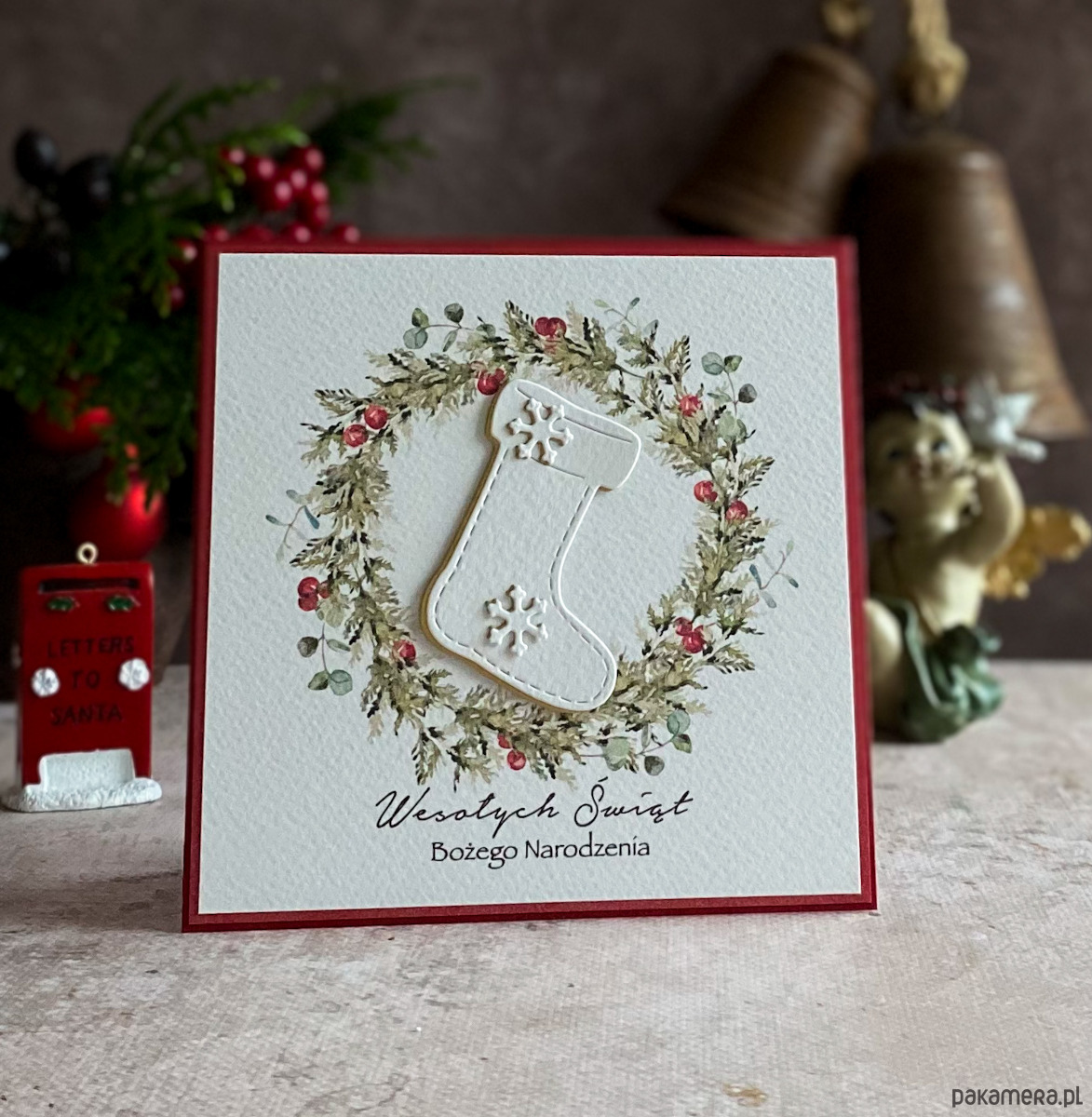 Zestaw z graficznym świątecznym wiankiem, ręcznie wyciętym dekorem oraz kolorystycznie dopasowaną kopertą.