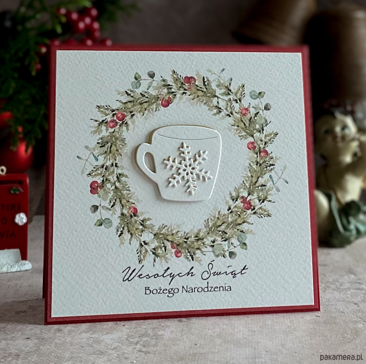 Zestaw z graficznym świątecznym wiankiem, ręcznie wyciętym dekorem oraz kolorystycznie dopasowaną kopertą.