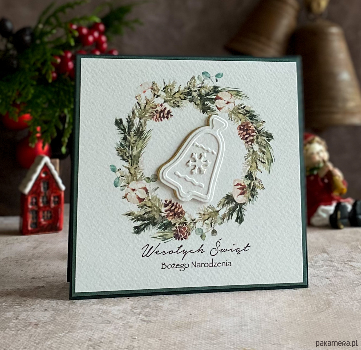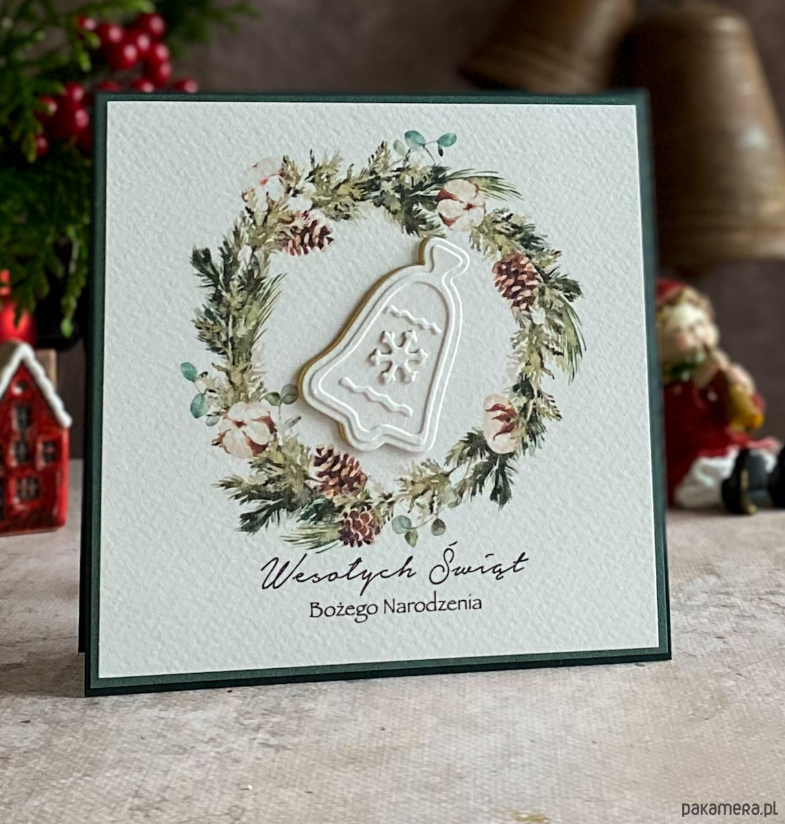 Zestaw z graficznym świątecznym wiankiem, ręcznie wyciętym dekorem oraz kolorystycznie dopasowaną kopertą.