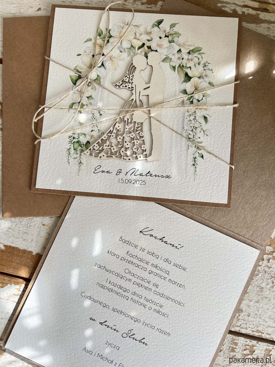 Personalizowana kartka ślubna, na ślub wykonana jest na bazie papieru kraftowego z użyciem starannie wyselekcjonowanego papieru bawełnianego w kolorze śmietanki z nadrukiem oraz tekturkową ozdobą. Kartka przewiązana jest lnianym sznureczkiem.