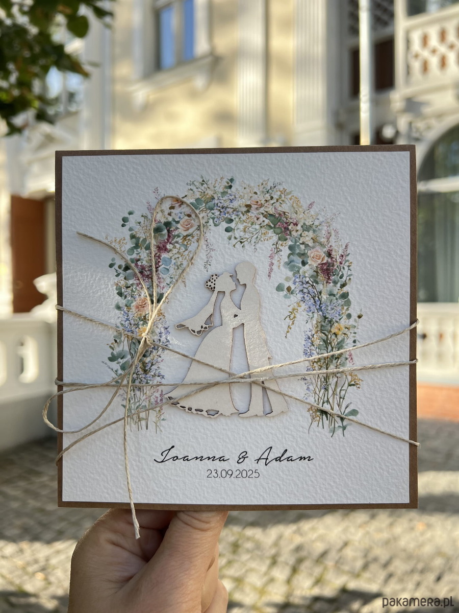 Personalizowana kartka ślubna, na ślub wykonana jest na bazie papieru kraftowego z użyciem starannie wyselekcjonowanego papieru bawełnianego w kolorze śmietanki z nadrukiem oraz tekturkową ozdobą. Kartka przewiązana jest lnianym sznureczkiem.