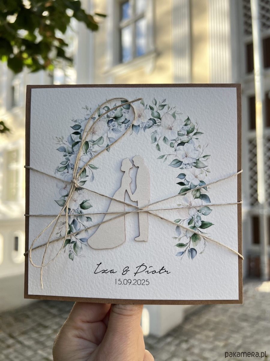 Personalizowana kartka ślubna, na ślub wykonana jest na bazie papieru kraftowego z użyciem starannie wyselekcjonowanego papieru bawełnianego w kolorze śmietanki z nadrukiem oraz tekturkową ozdobą. Kartka przewiązana jest lnianym sznureczkiem.