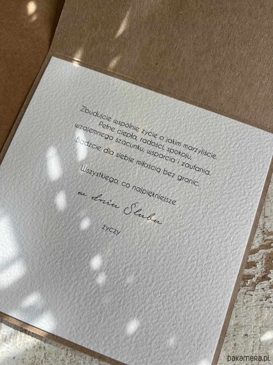 W środku wklejona jest jedna kartka z papieru bawełnianego z życzeniami bądź kartka pusta, gotowa do wpisania życzeń własnoręcznie.