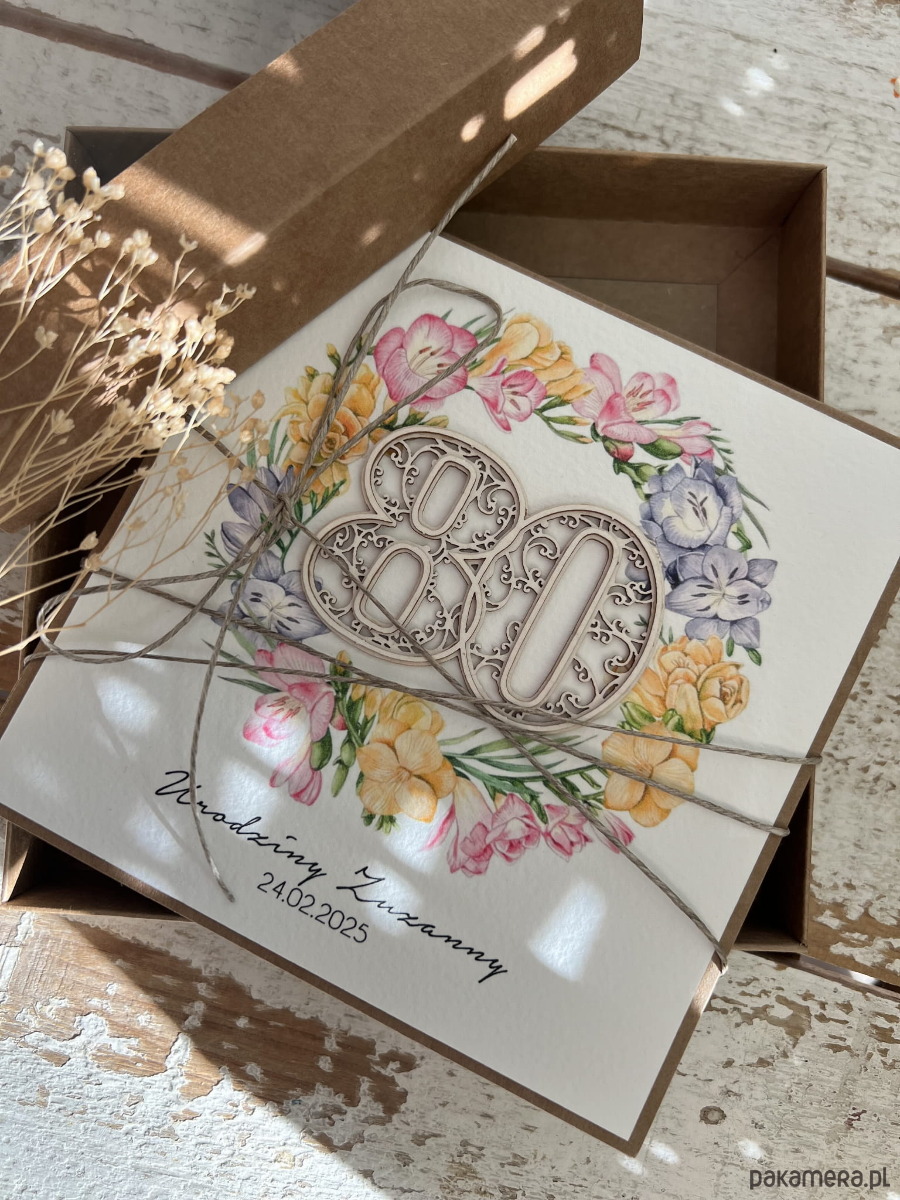Personalizowana kartka ręcznie robiona z pudełkiem na 80 urodziny