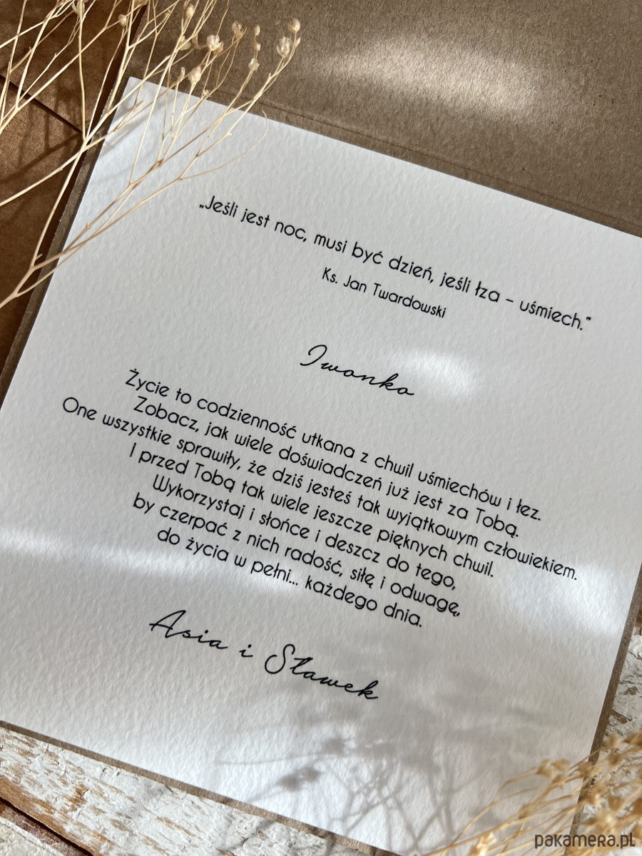 Jeśli będę miała jakiekolwiek wątpliwości co do realizacji będę się kontaktować :) Jednocześnie kartkę wykonuję z najwyższą dbałością stąd zrobię wszystko, by podany tekst ułożony został z zachowaniem estetyki, subtelności, minimalizmu i czytelnie podkreślając w nim to co najważniejsze.