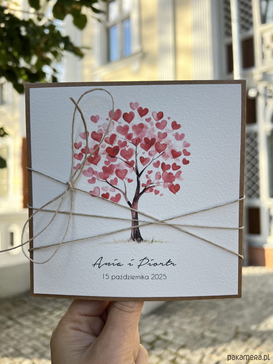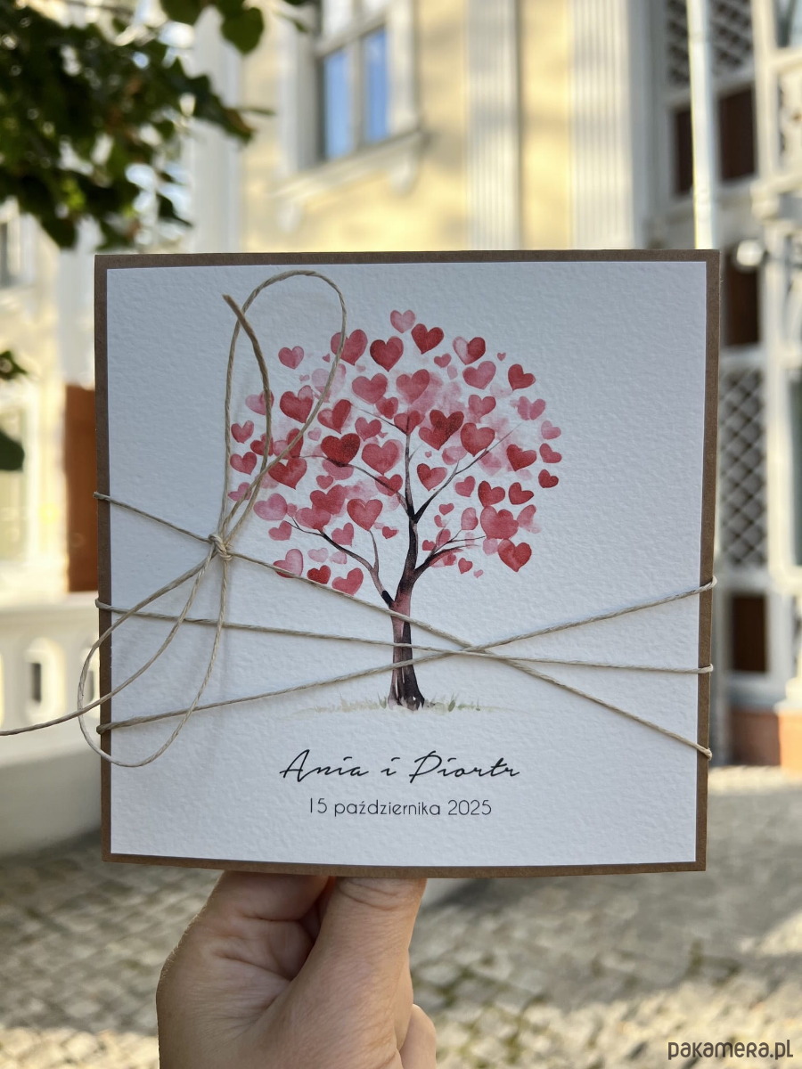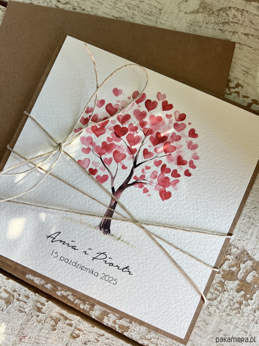 Personalizowana kartka ślubna, na ślub wykonana jest na bazie papieru kraftowego z użyciem starannie wyselekcjonowanego papieru bawełnianego w kolorze śmietanki z nadrukiem obrazu. Kartka przewiązana jest lnianym sznureczkiem.