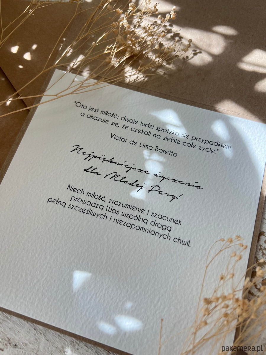 W środku wklejona jest jedna kartka z papieru bawełnianego z życzeniami bądź kartka pusta, gotowa do wpisania życzeń własnoręcznie.