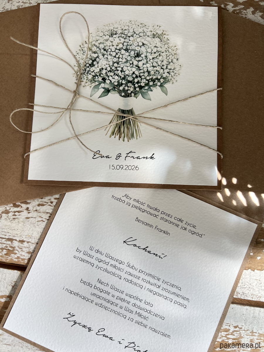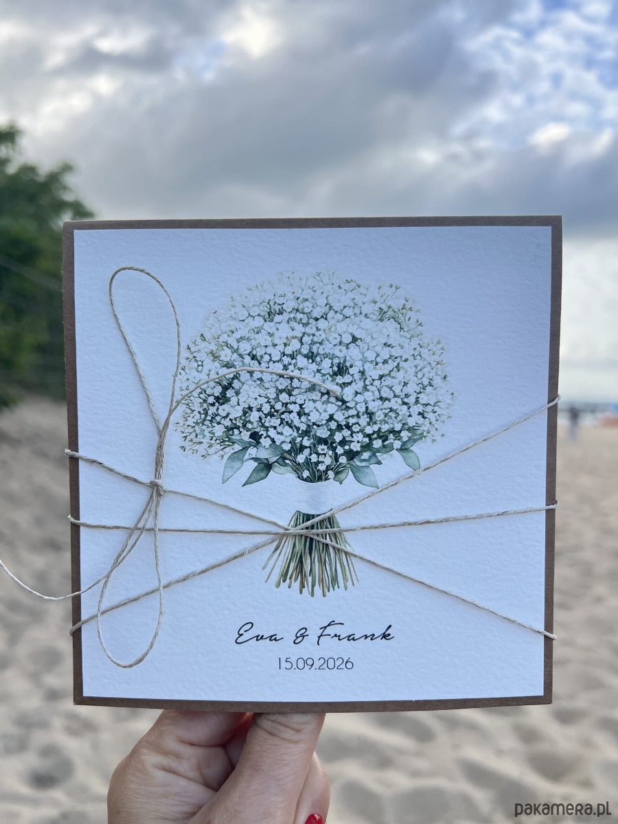 Personalizowana kartka ślubna, na ślub wykonana jest na bazie papieru kraftowego z użyciem starannie wyselekcjonowanego papieru bawełnianego w kolorze śmietanki z nadrukiem oraz grafiką. Kartka przewiązana jest lnianym sznureczkiem.