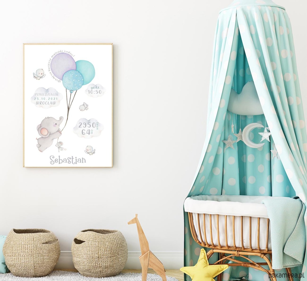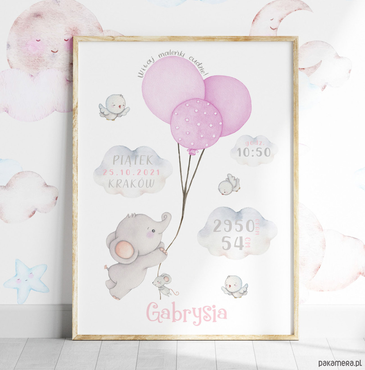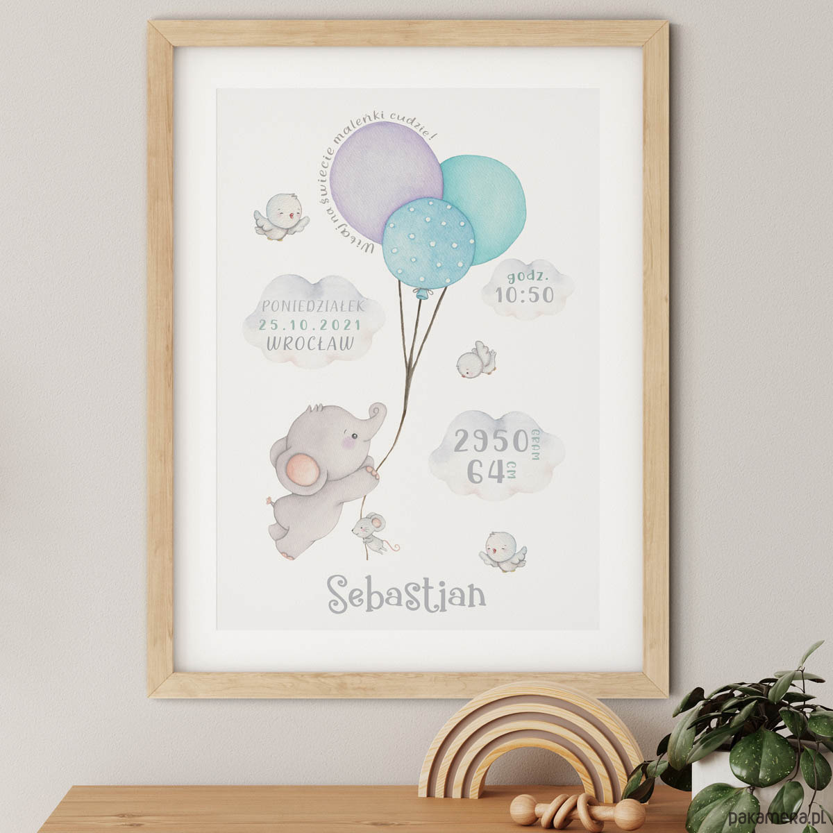 Metryczka do pokoju chłopca prezentująca moją własnoręczną pracę akwarelową. Obrazek w ramce ze słonikiem unoszącym się na niebieskich balonikach w otoczeniu chmurek. Towarzystwa dotrzymują mu trzy wesołe ptaszki oraz mała myszka.