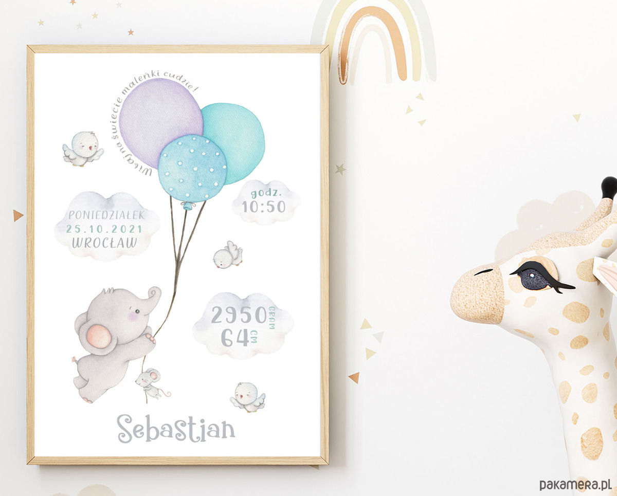 Personalizowana metryczka dla chłopca Słonik z balonikami Obrazek