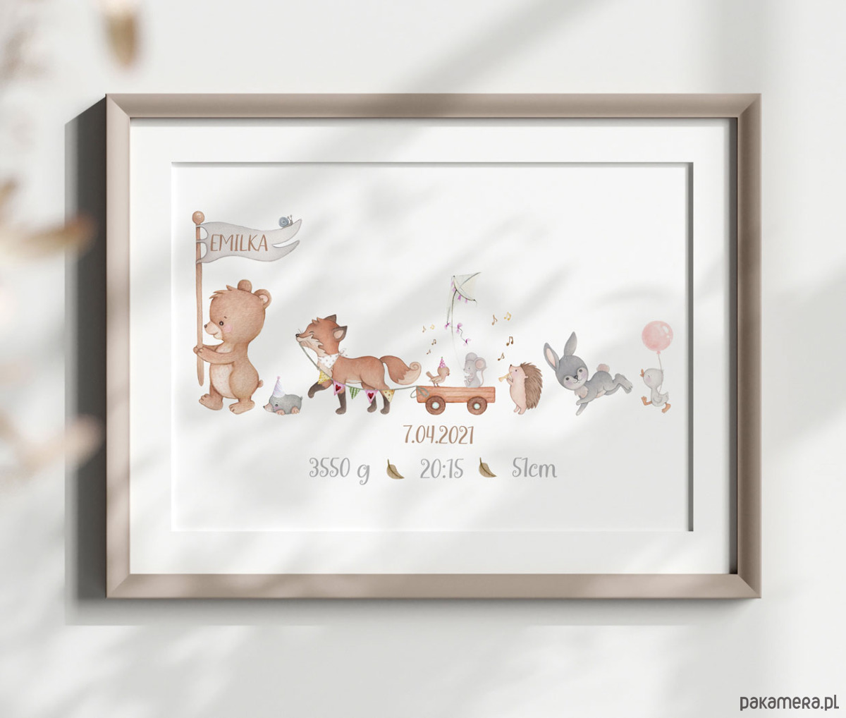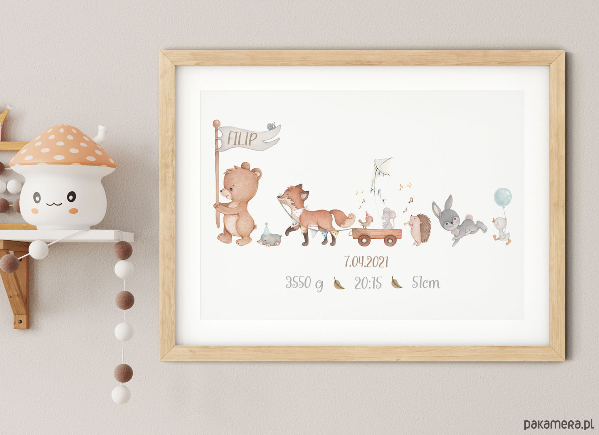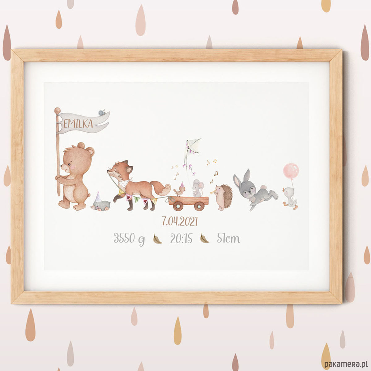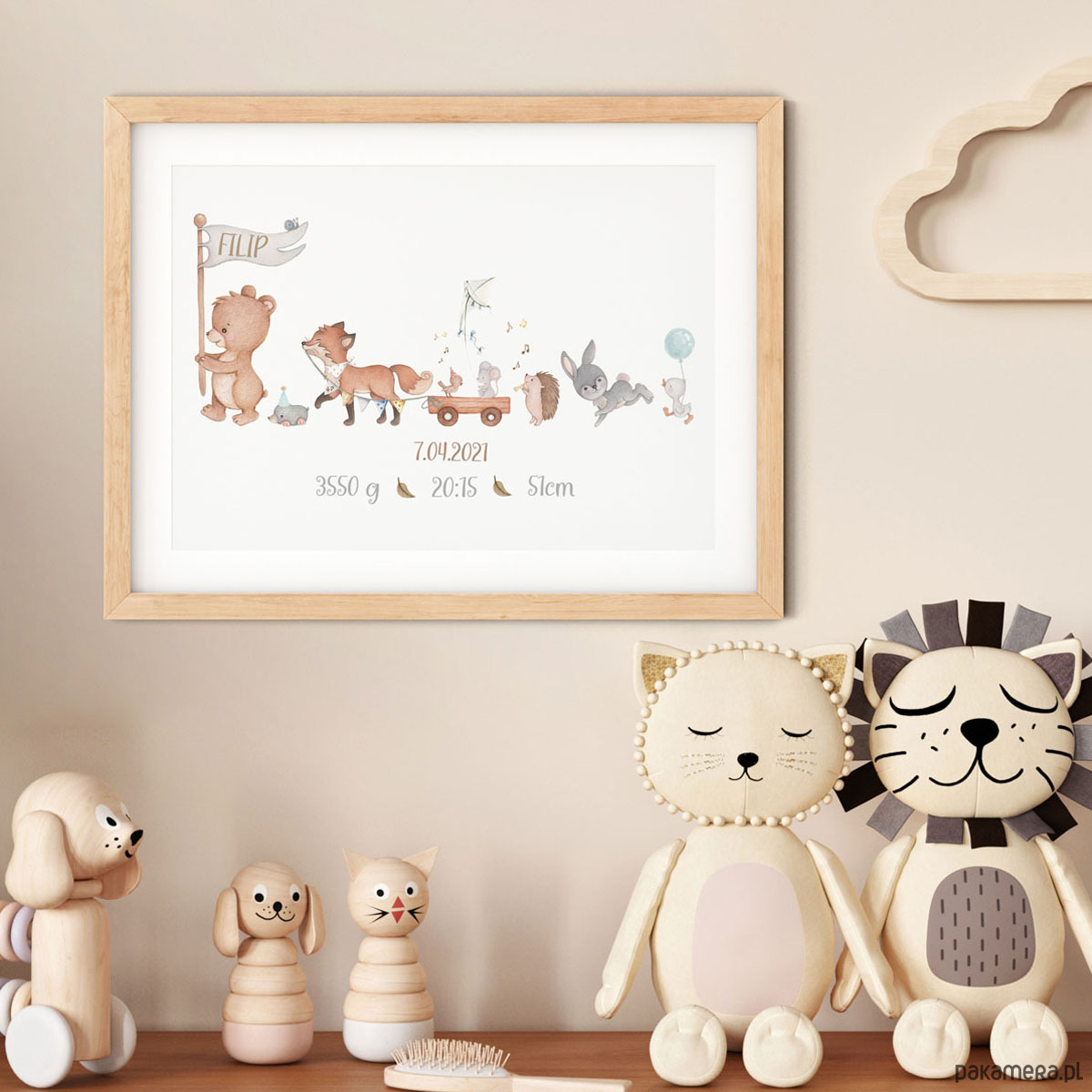 Metryczka do pokoju chopca z pracą akwarelową mojego autorstwa. Obrazek przedstawia wesołe zwierzęta leśne, które z okazji narodzin dziecka ruszyły, aby świętować to doniosłe wydarzenie. Twojemu dziecku towarzystwa dotrzymają miś, lisek, jeżyk, krecik, ptaszek, zajączek, kaczuszka i myszka.