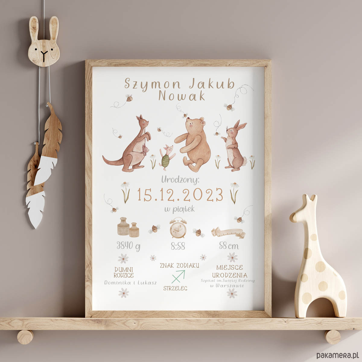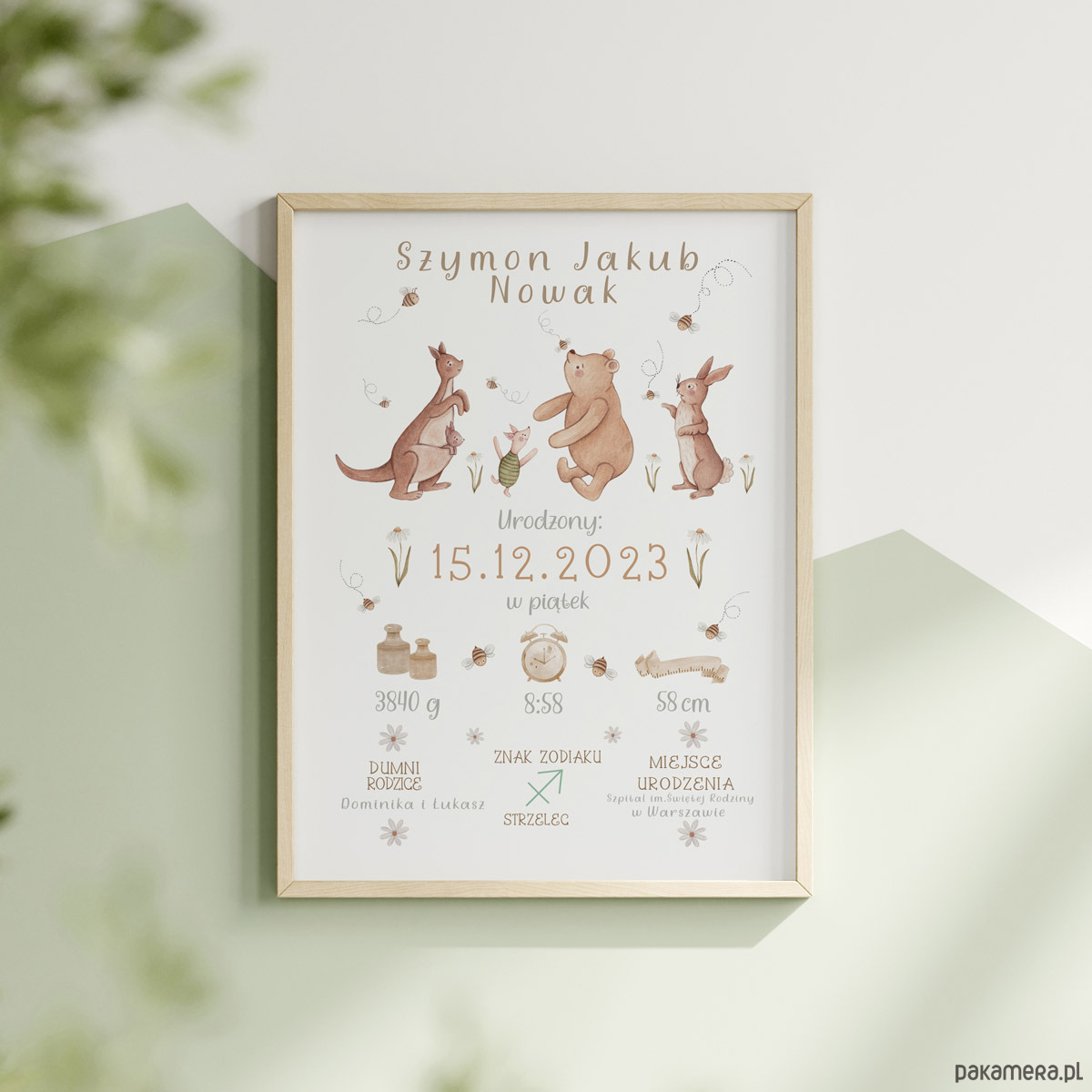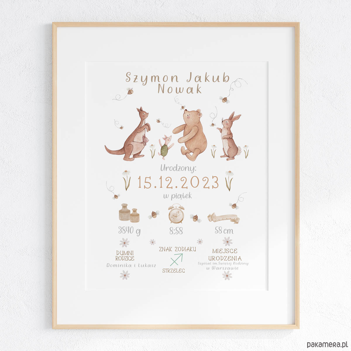 Personalizowana metryczka dla niemowlęcia z Kubusiem Puchatkiem, Królikiem, Prosiaczkiem, Kangurzycą, Maleństwem. Ilustracja stworzona przeze mnie z użyciem techniki akwarelowej wyróżnia się pastelowymi barwami.