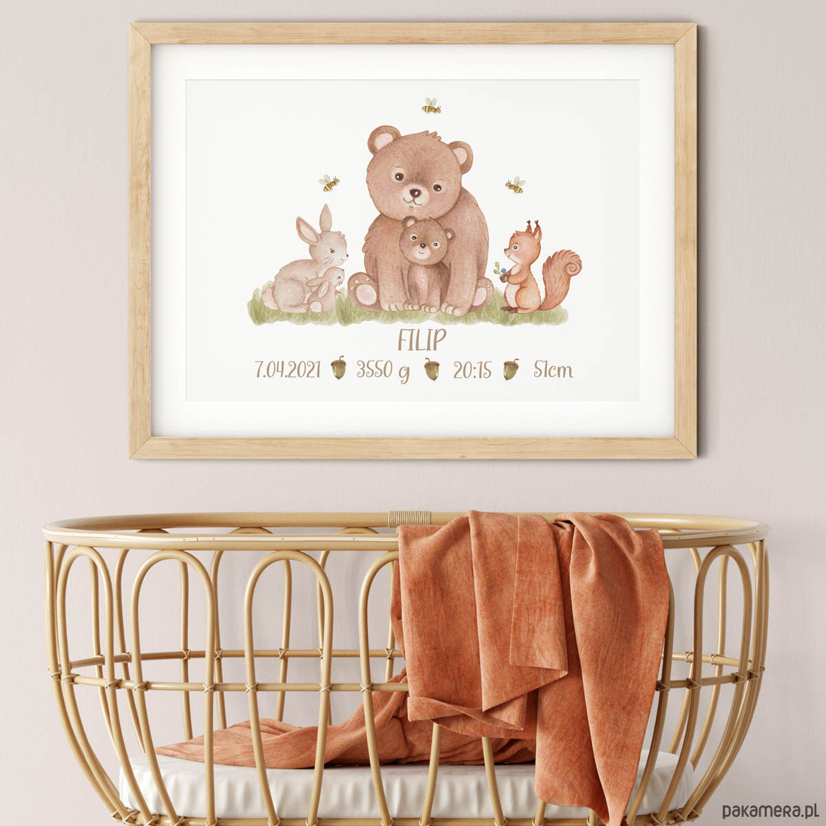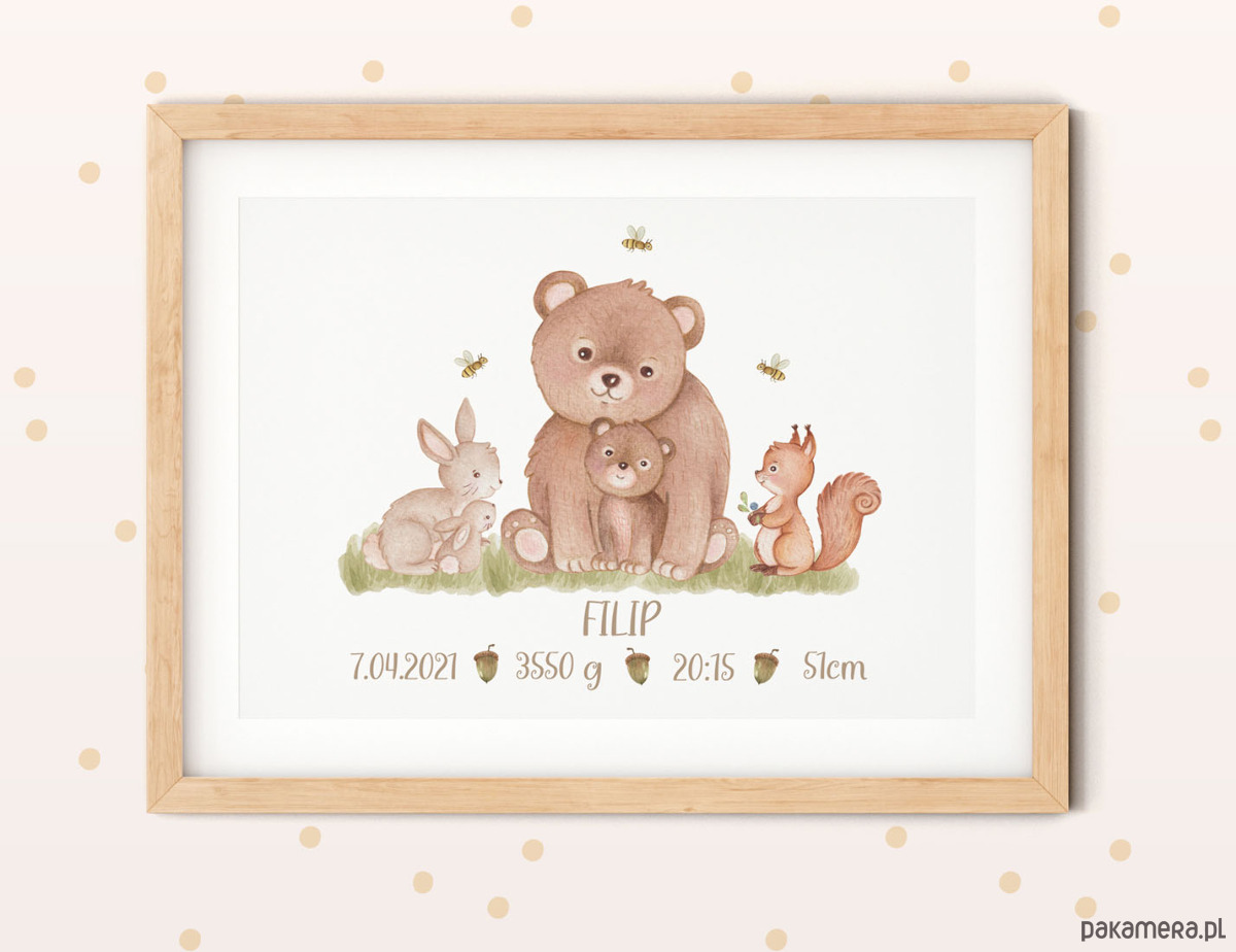 Metryczka na ścianę do pokoju dziecka z pracą akwarelową mojego autorstwa. Na obrazku widoczne są zwierzątka leśne w pastelowych barwach, wśród których znajduje się niedźwiedzica z młodym, dwa zające i wiewiórka. Mieszkańcom lasu towarzystwa dotrzymują pszczoły.
