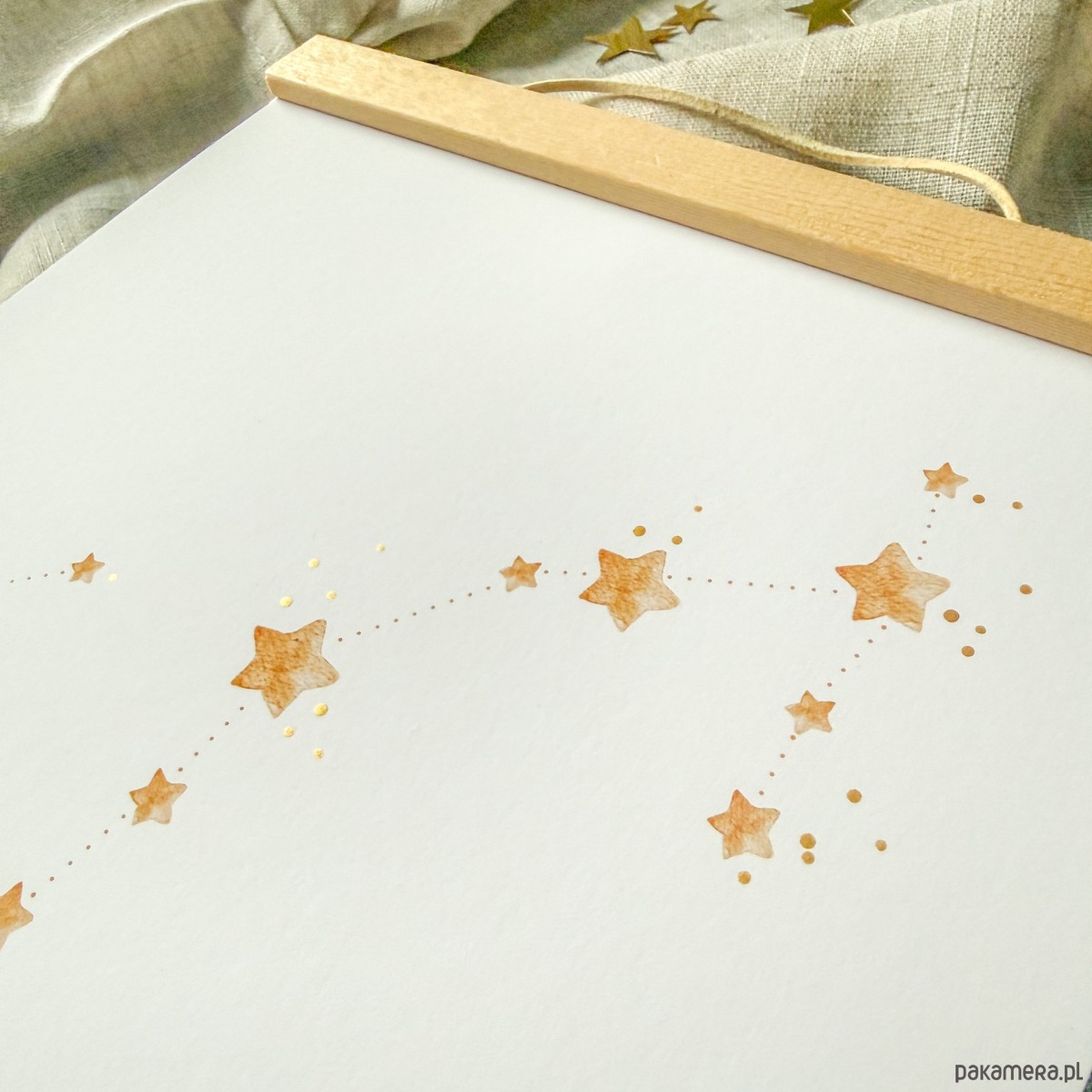 Delikatne złote kropeczki namalowane oryginalną złotą akwarelą migoczą niczym prawdziwe gwiazdy, tworząc subtelny, błyszczący efekt 3D.