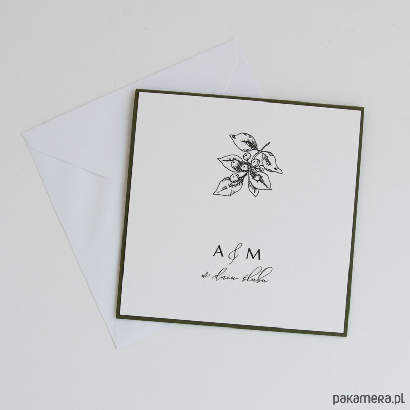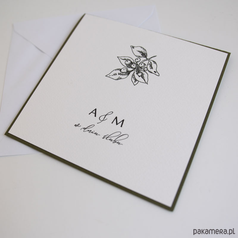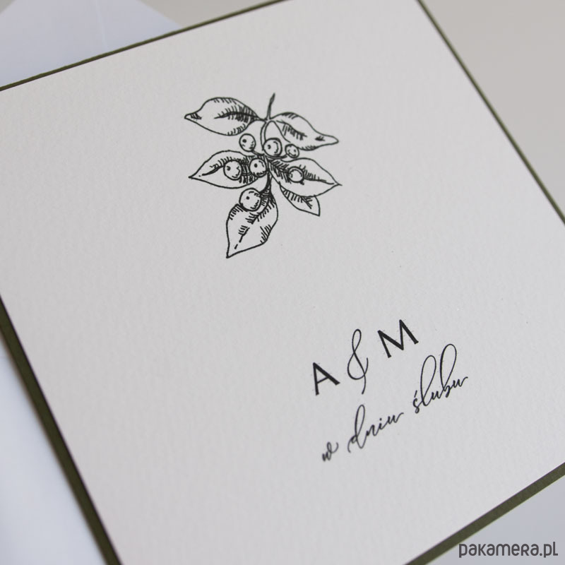 Front kartki zdobi wydruk autorskiej ilustracji oraz inicjały pary młodej, wewnątrz wydrukowane będą spersonalizowane życzenia.
