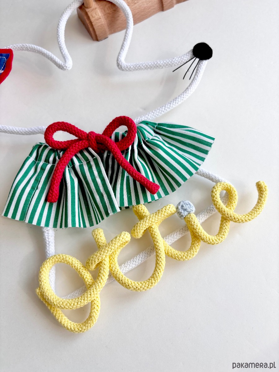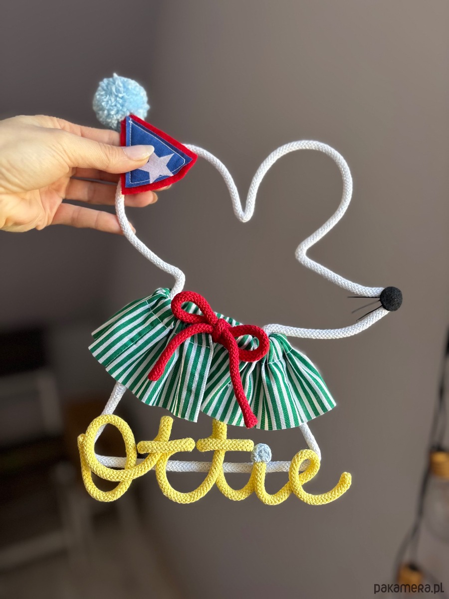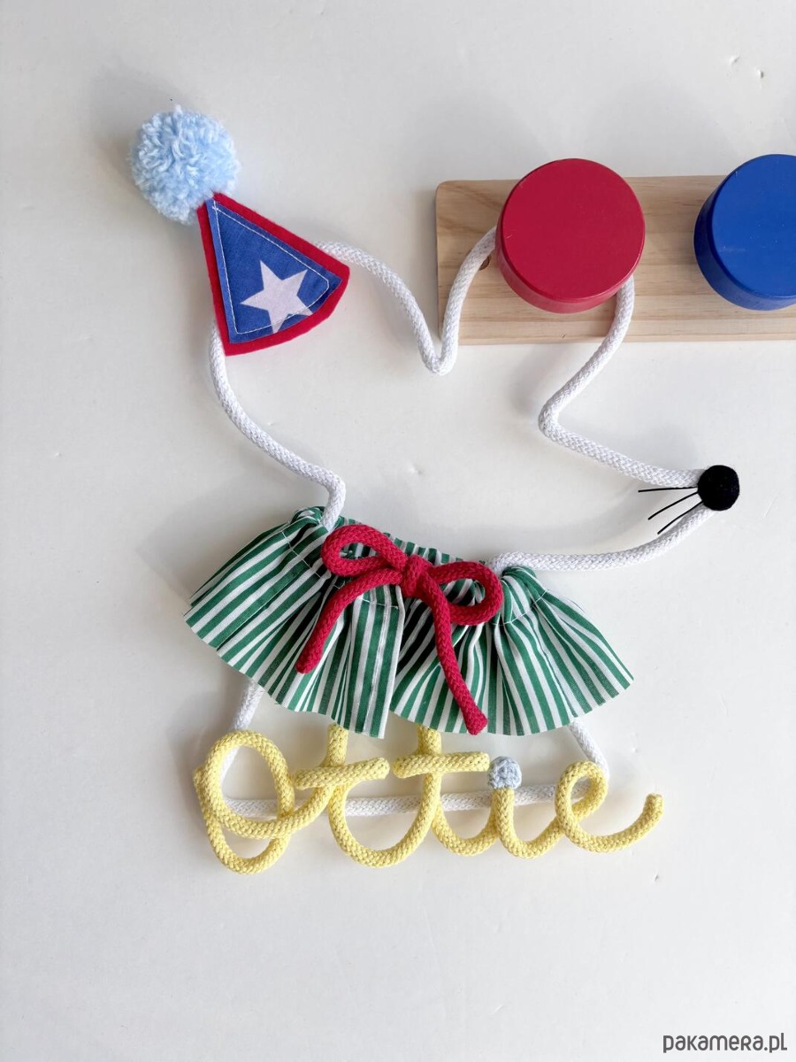 Urocza myszka cyrkowa z imieniem dziecka to wyjątkowa dekoracja do pokoju dziecięcego lub niemowlęcego. Ta mała artystka z cyrku wnosi do wnętrza odrobinę magii, radości i dziecięcej wyobraźni.