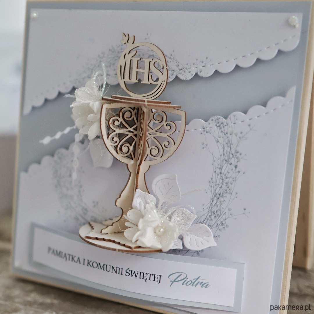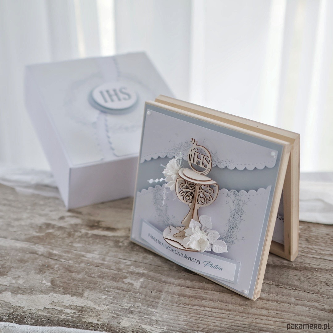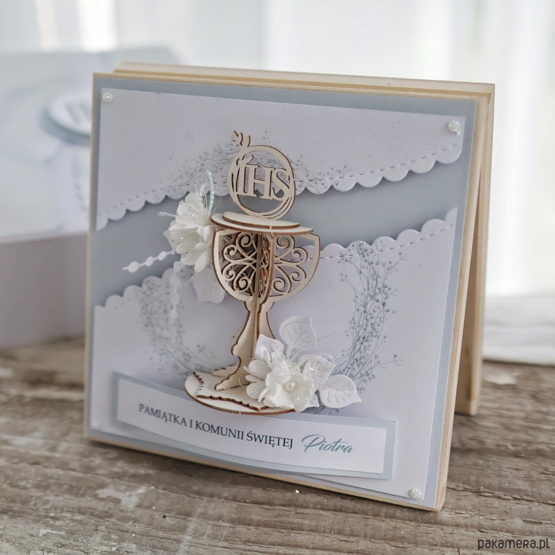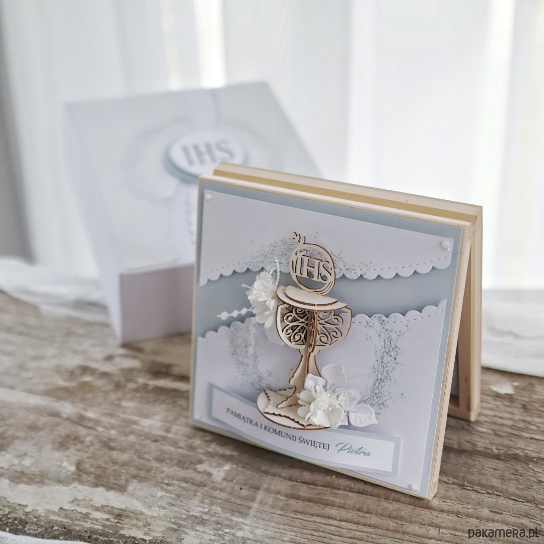 Elegancka pamiątka Pierwszej Komunii Świętej w drewnianym pudełku to wyjątkowy prezent na tę ważną uroczystość. Na przodzie kartki znajduje się kielich 3D i delikatną kompozycją kwiatową, która nadaje całości elegancki i uroczysty charakter.