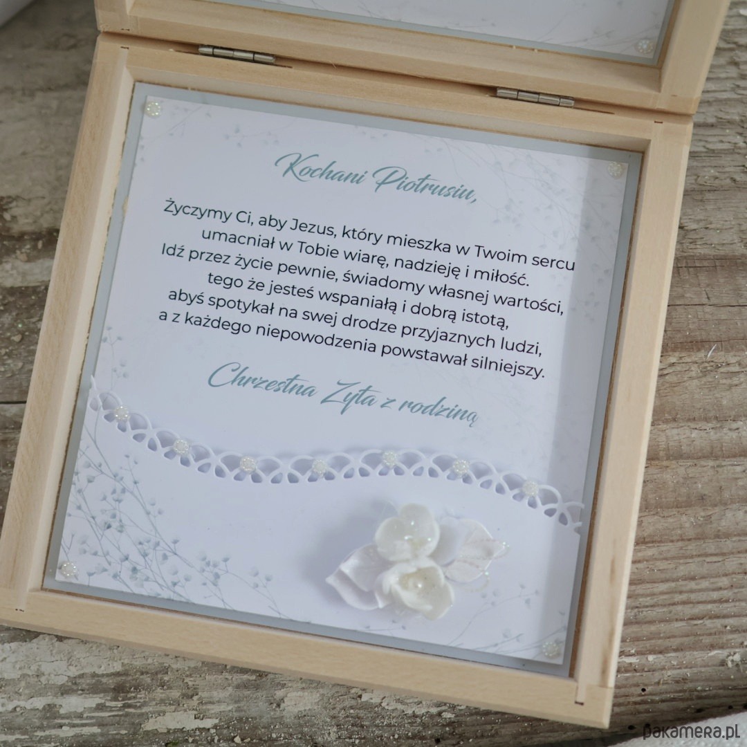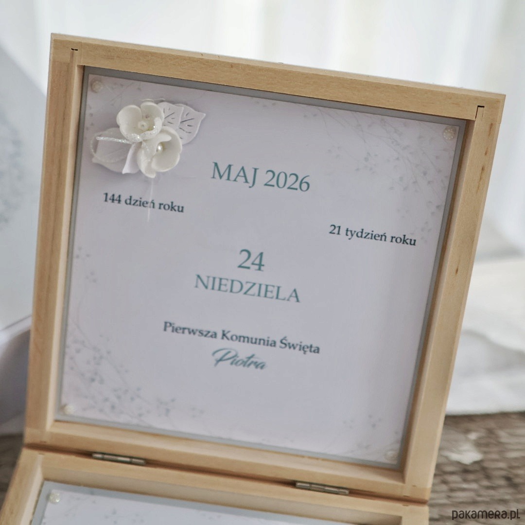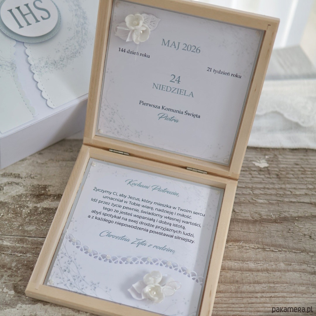 Personalizowana pamiątka Pierwszej Komunii Świętej w drewnianym pudełku