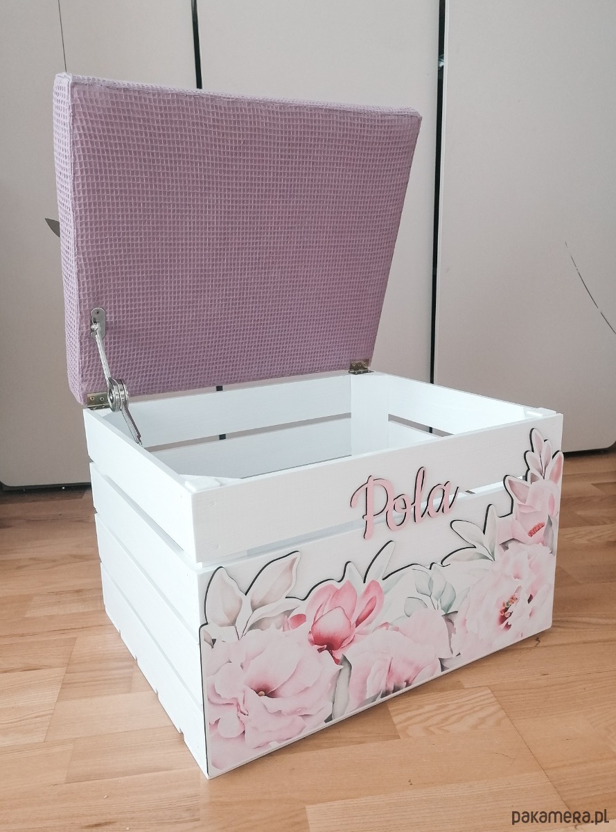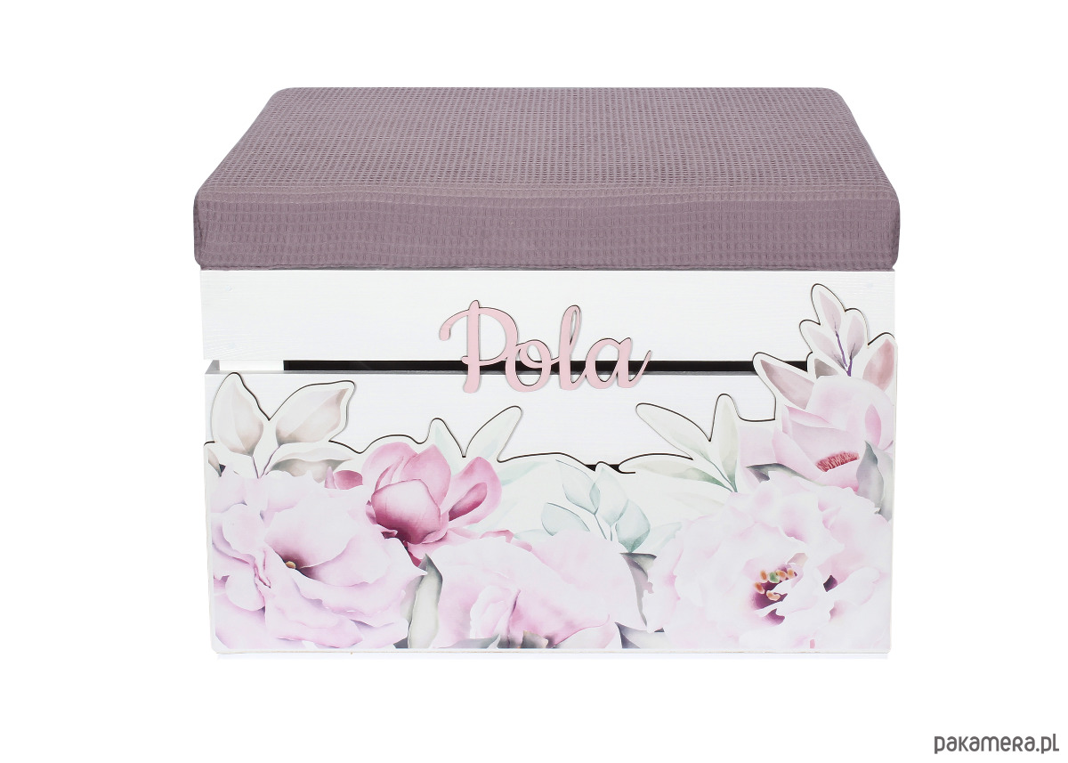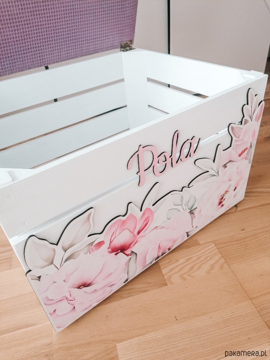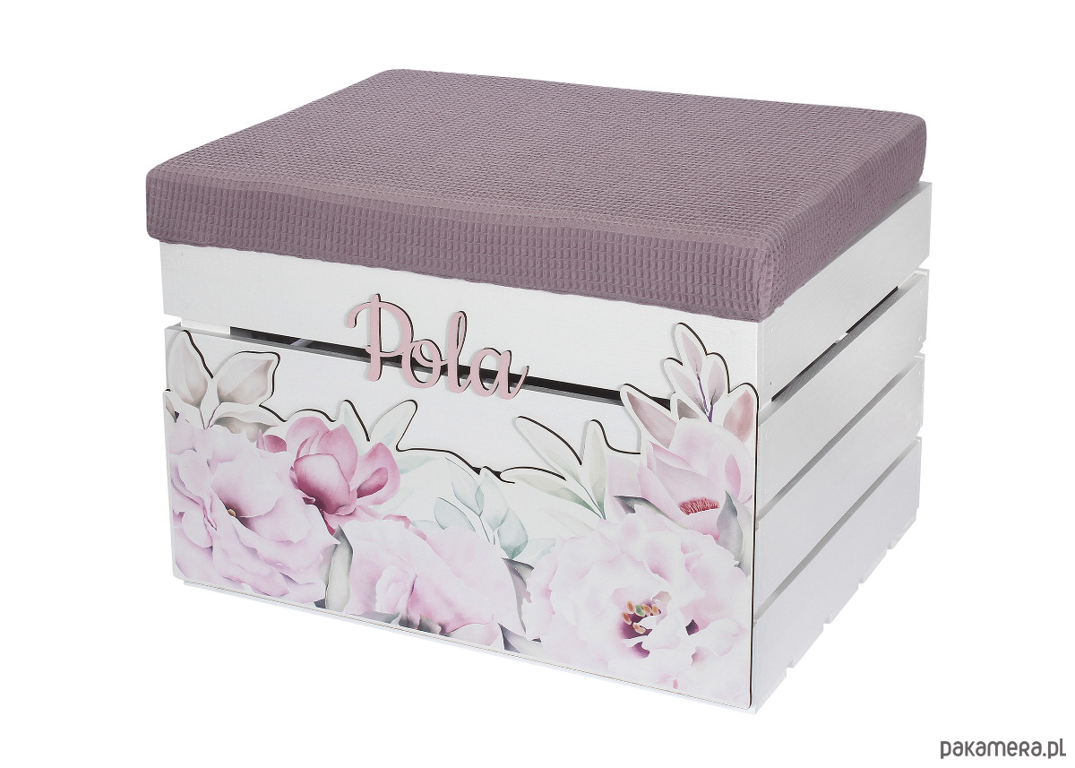 Delikatne kolory, duży dekor piwonie i imię sprawia że skrzynia staje sie czymś więcej niż zwykłą skrzynią.