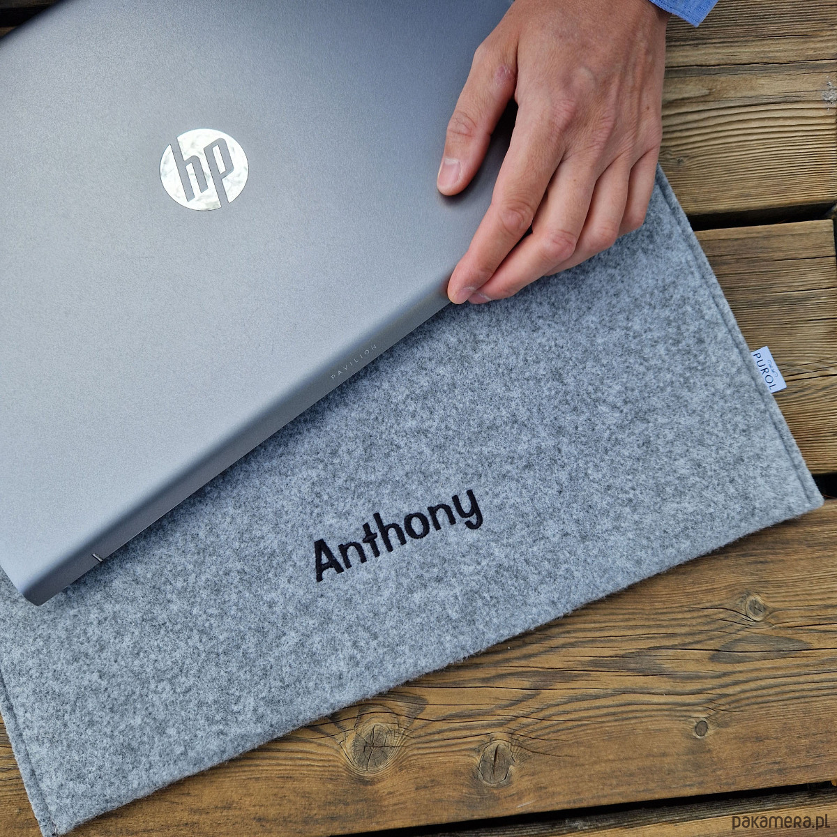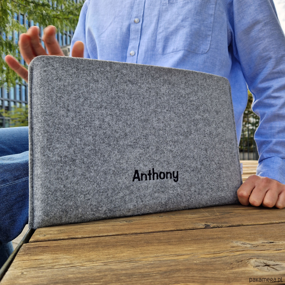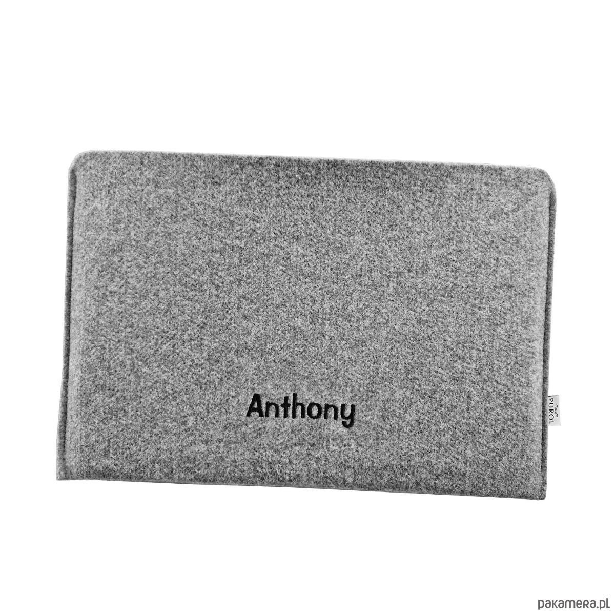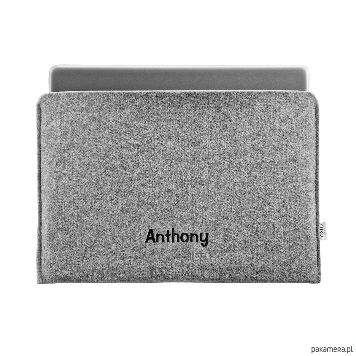 Uszyty na wymiar filcowy pokrowiec na laptopa z wyhaftowanym imieniem. Ręcznie wykonane etui - wersja pozioma.